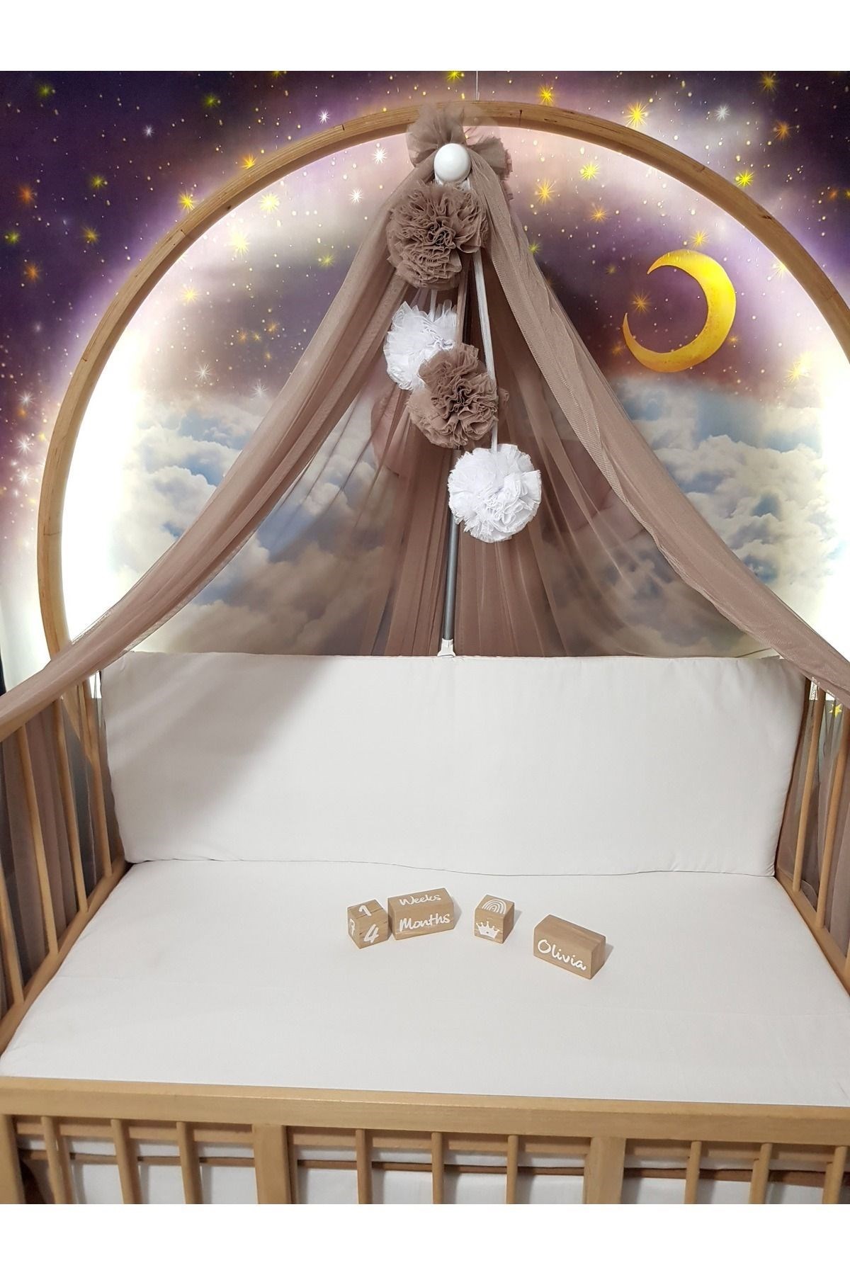 Bebek Lüks Cibinlik Takımı - Dört Ponponlu Kahverengi Likra Tül (Cibinlik Aparatı Dahil)