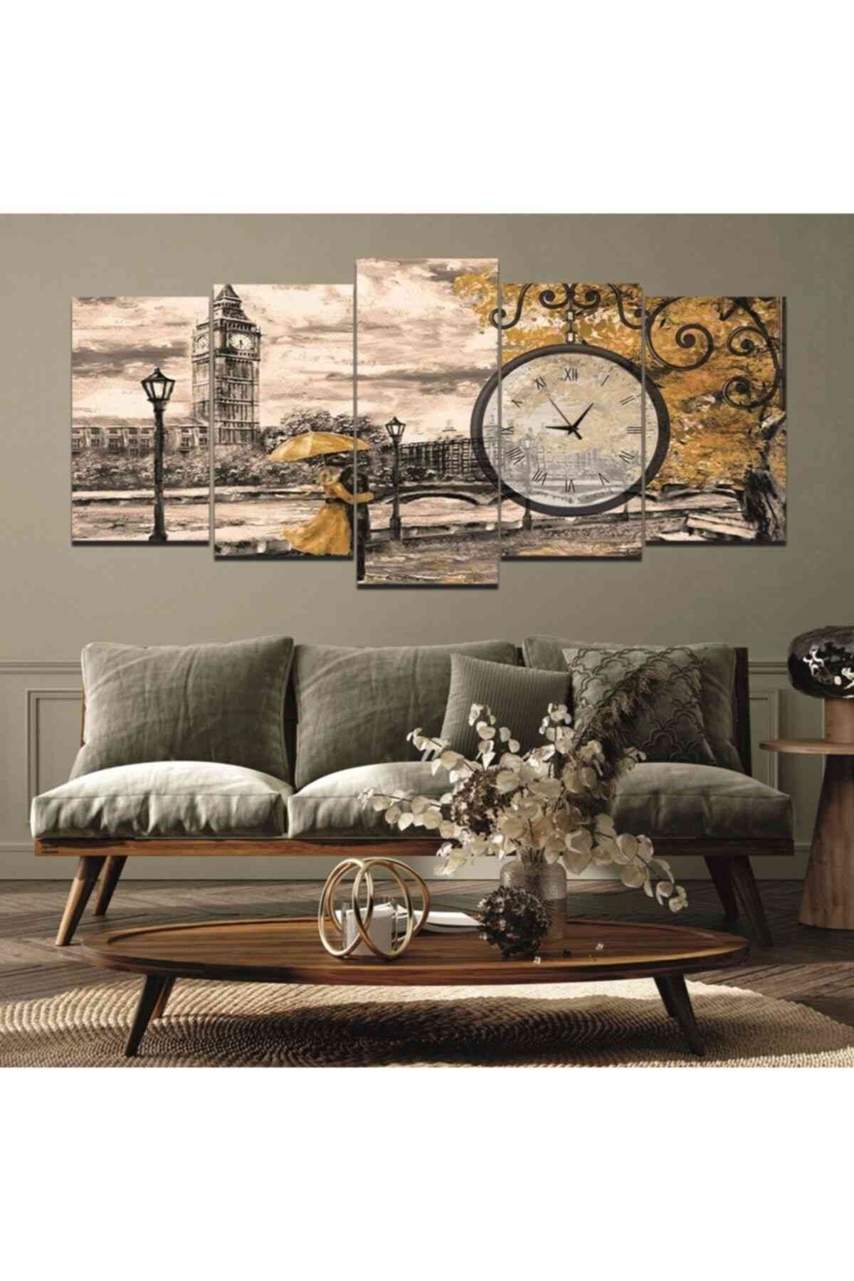 5 Parça London Temalı Saatli Mdf Tablo