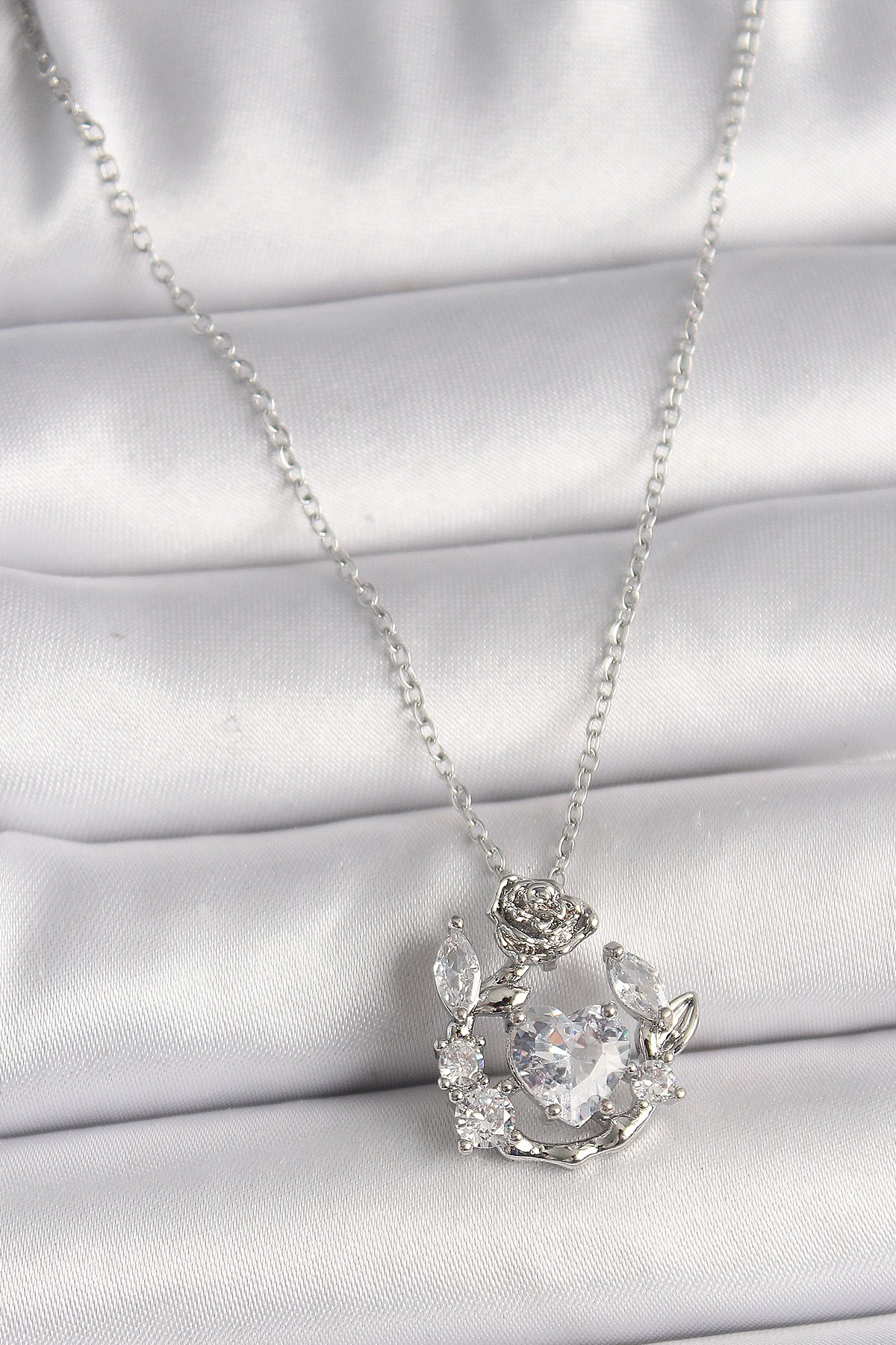 316L Çelik Gümüş Renk Zincir Zirkon Taş Detaylı Kalp Model Kadın Kolye