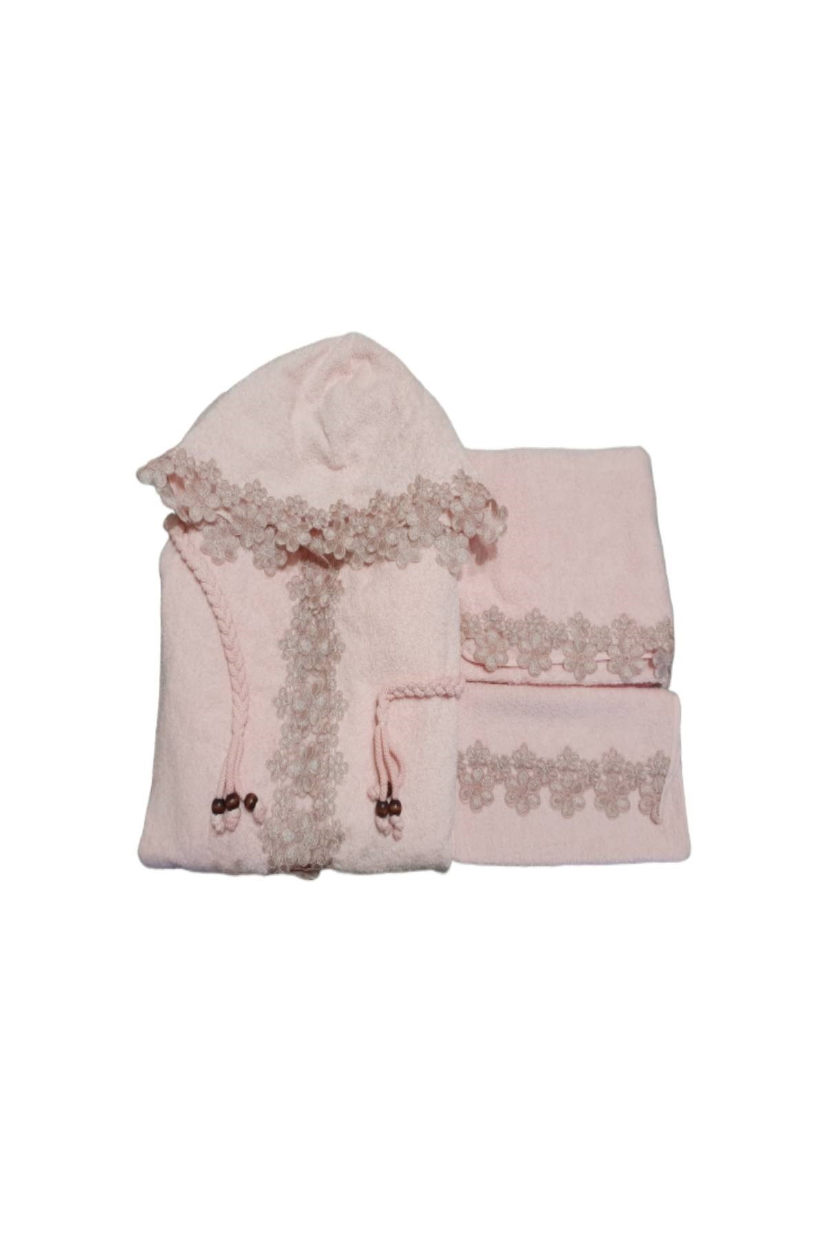 Just Home Fransız Dantelli Üçlü Kapşonlu Bayan Bornoz Seti Cottony
