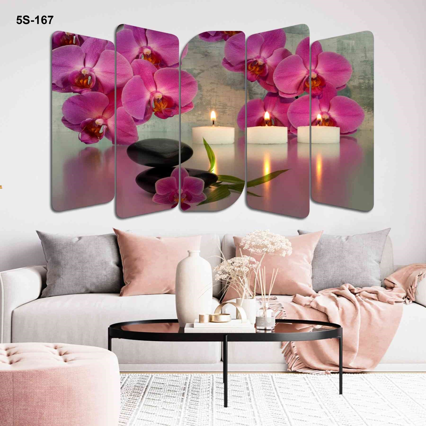 5 Parça Pembe Çiçek Mum Tasarım Mdf Tablo - 5S-167 100X60 5S-167