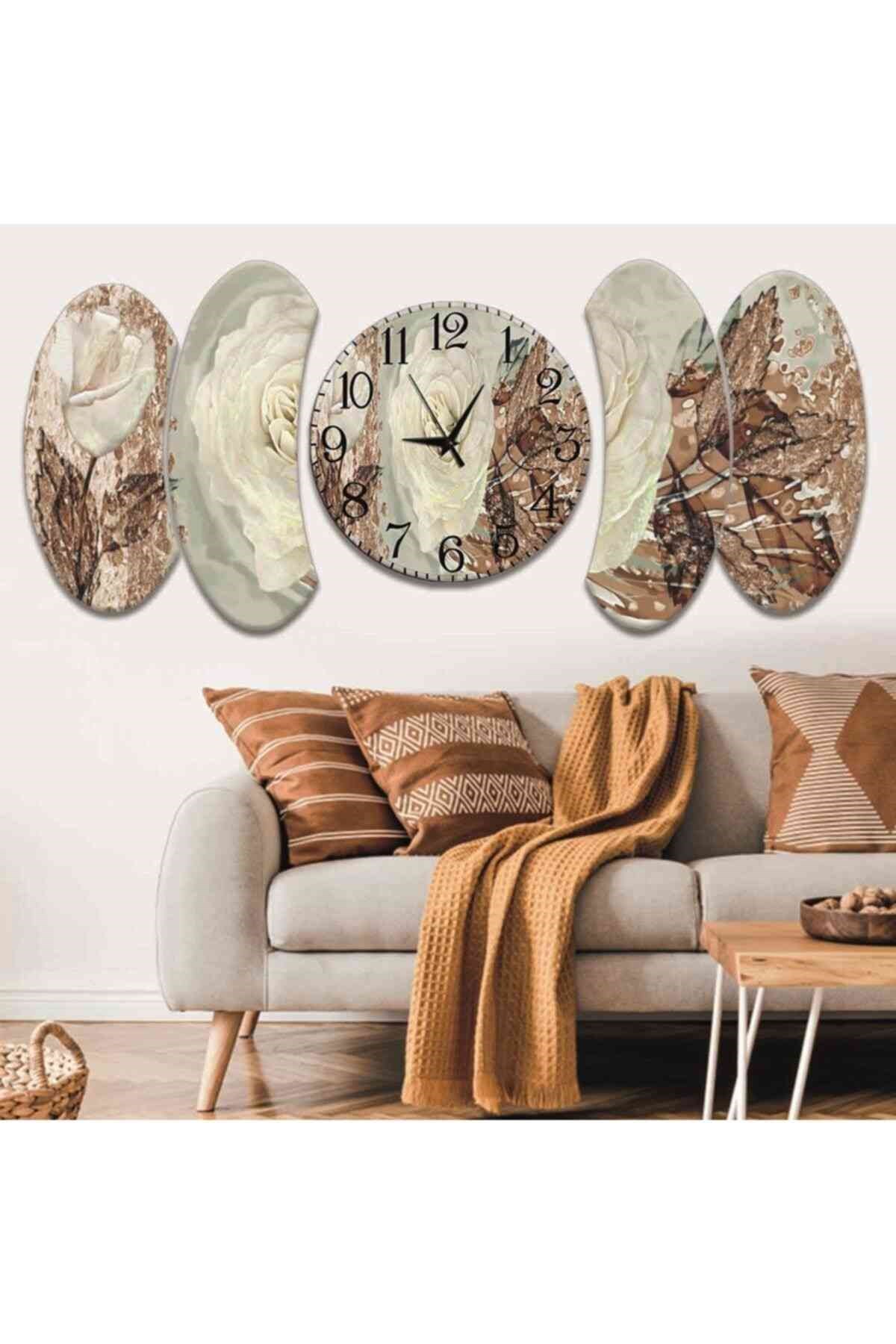5 Parça Beyaz Gül Temalı Saatli Mdf Tablo