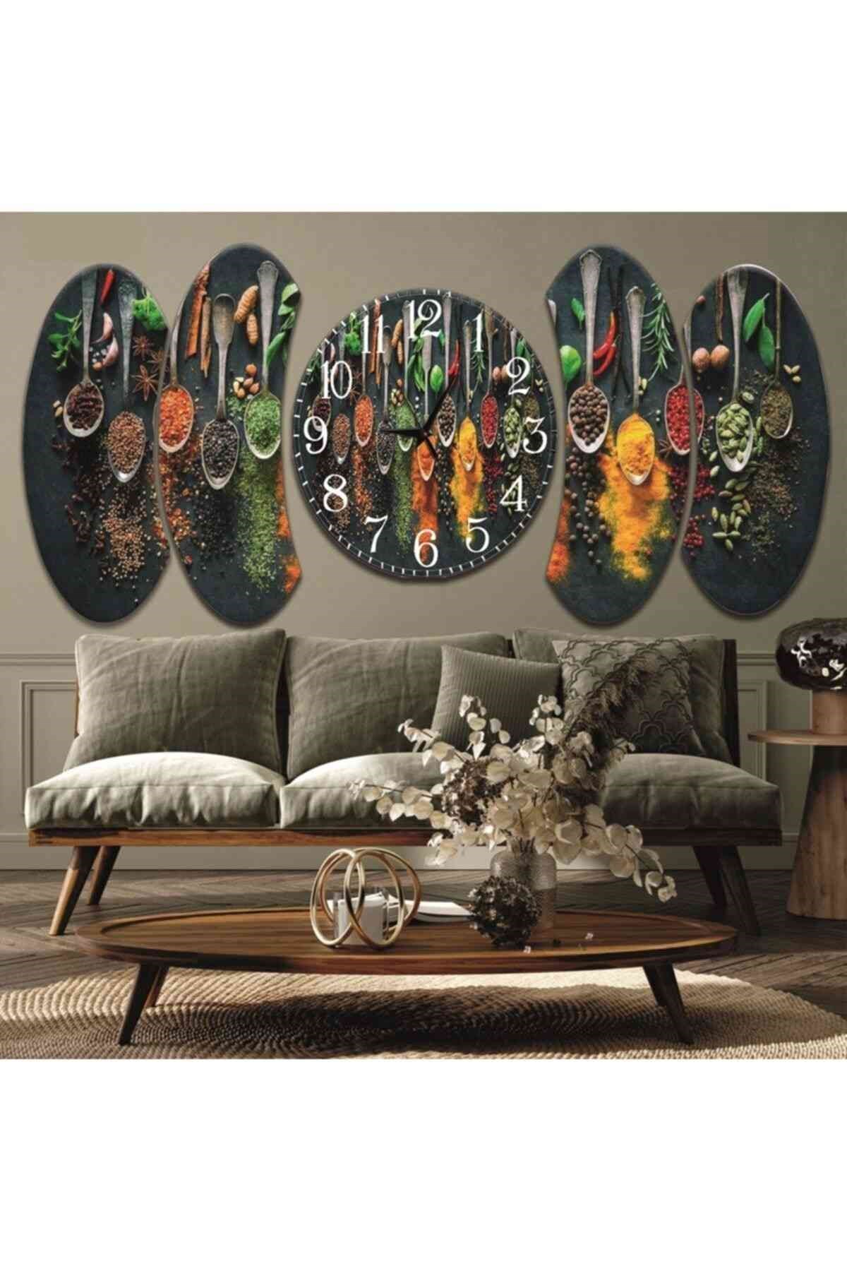 5 Parça Mutfak Ve Baharat Temalı - Saatli Mdf Tablo