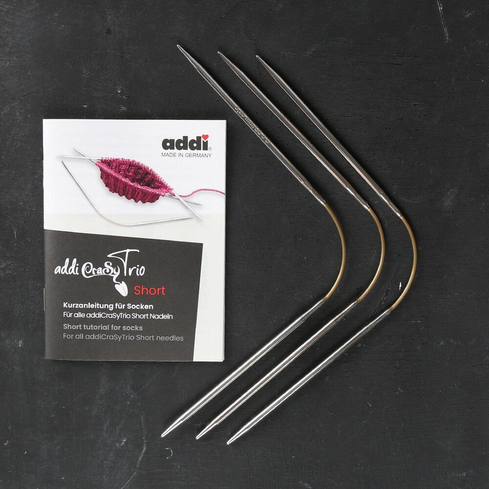 Addi dairesel örgü alanında dünyada bir devrim yaratıyor. Addi CrasyTrio misinalı üçlü çorap şiş seti ile, en küçük daireleri bile örmek artık bir çocuk oyuncağı. Bu şişlerin orta bölümündeki özel misinadan dolayı mümkündür ve her ele uygundur. Dairesel örüldüğünde, iki şişe yayılan ilmekler üçüncü şiş ile örülür. Bu yüzden, her turda sadece iki şiş değişikliği gereklidir.