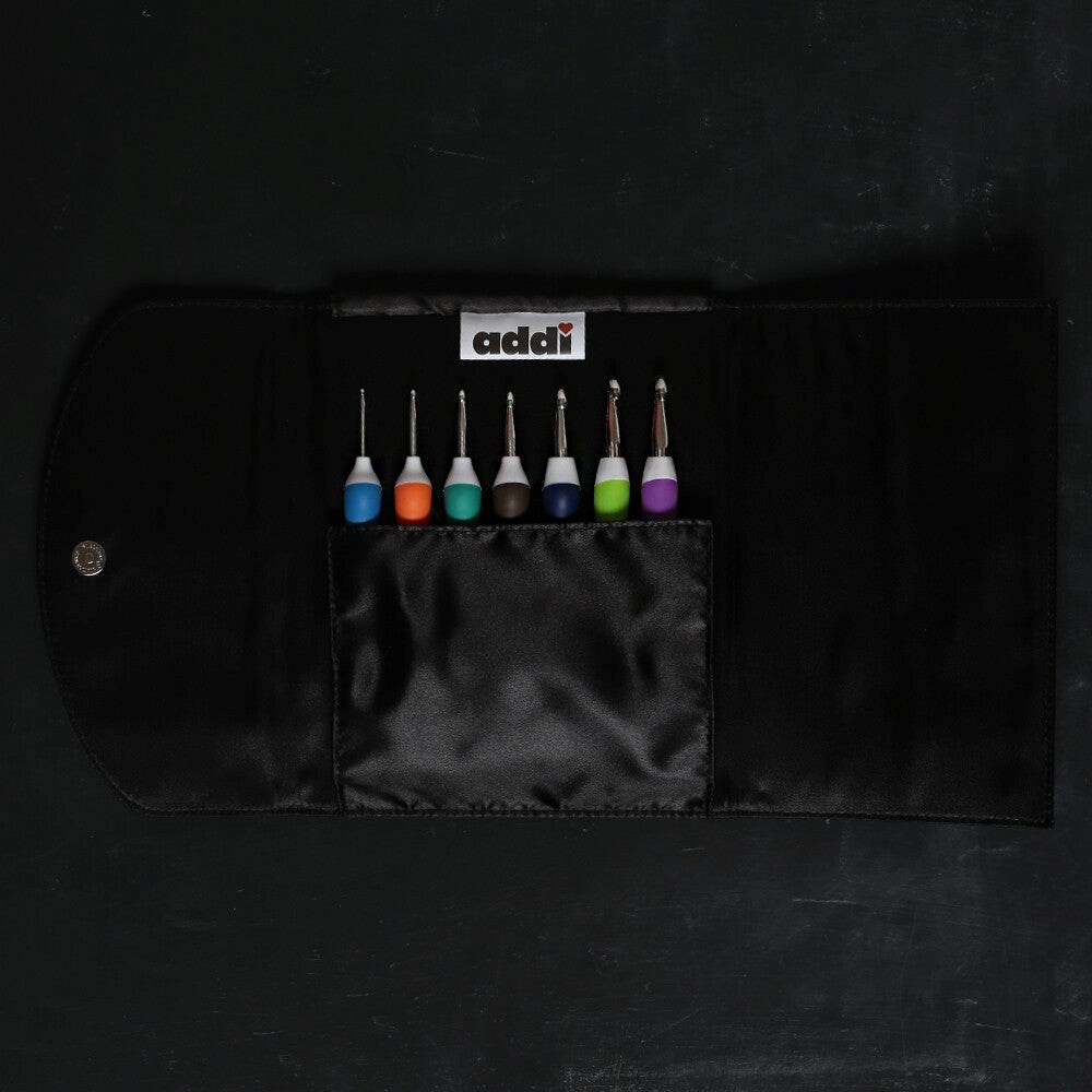 Addi Swing Tığ Seti, saklaması kolay deri çantası ile birlikte 7 Adet ergonomik yün tığı içerir.