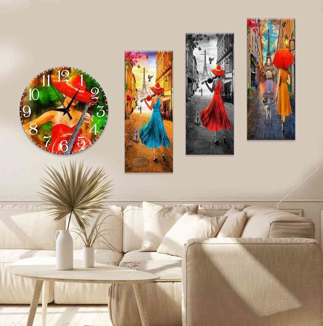 Evimona 4 Parça Kırmızı Şapkalı Kadın Temalı Mdf Saatli Tablo Ds-098