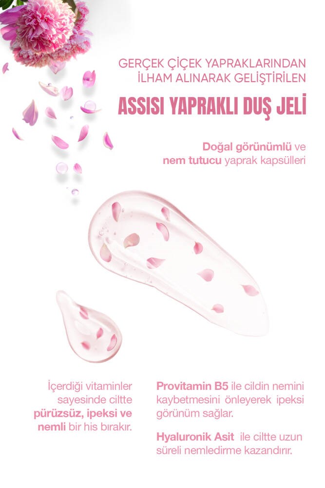 Duş deneyiminizi zenginleştiren Peony Bouquet Hyaluronic Acid & Provitamin B5 nemlendirici yapraklı duş jeli ile besleyici ve ferahlatıcı bir cilt dokunuşu sizi bekliyor! Eşsiz şakayık (peony) buketi aroması, hyaluronik asit ve Provitamin B5 içeriğiyle duş rutininize lüks bir bakım katın.