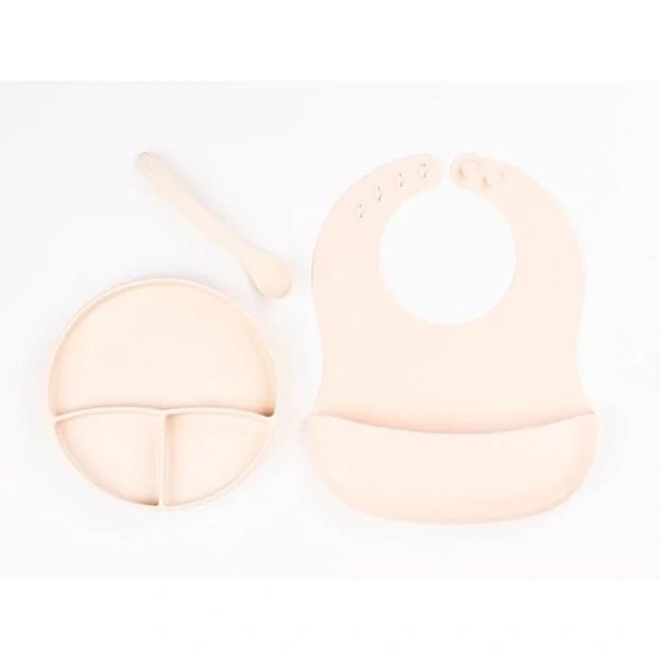 Krem Rengi 3’lü Silikon Yemek Seti – Önlük + Diş Kaşıyıcılı Kaşık + Vakumlu Tabak