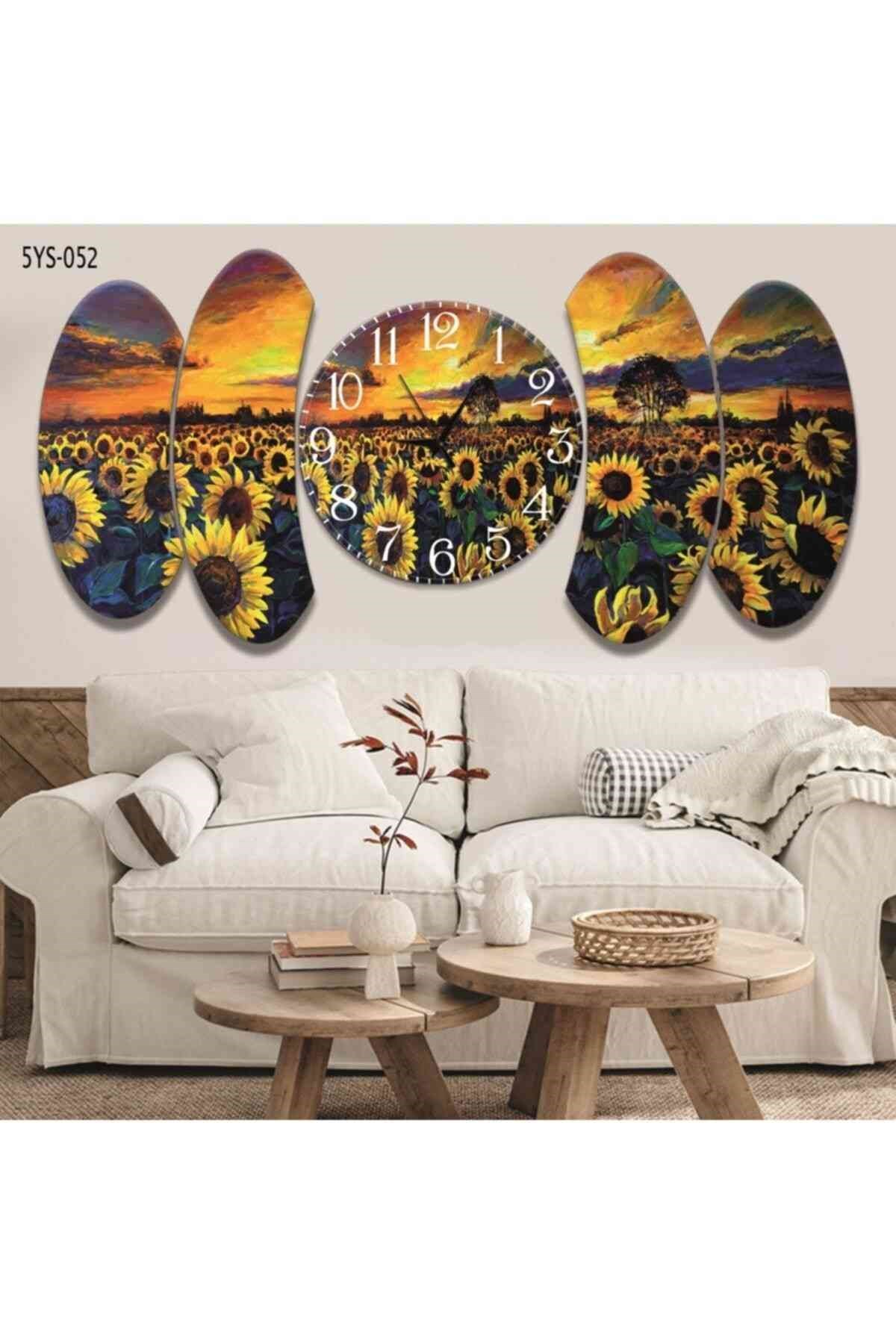5 Parça Ayçiçek Doğa Temalı Tasarım Saatli Mdf Tablo