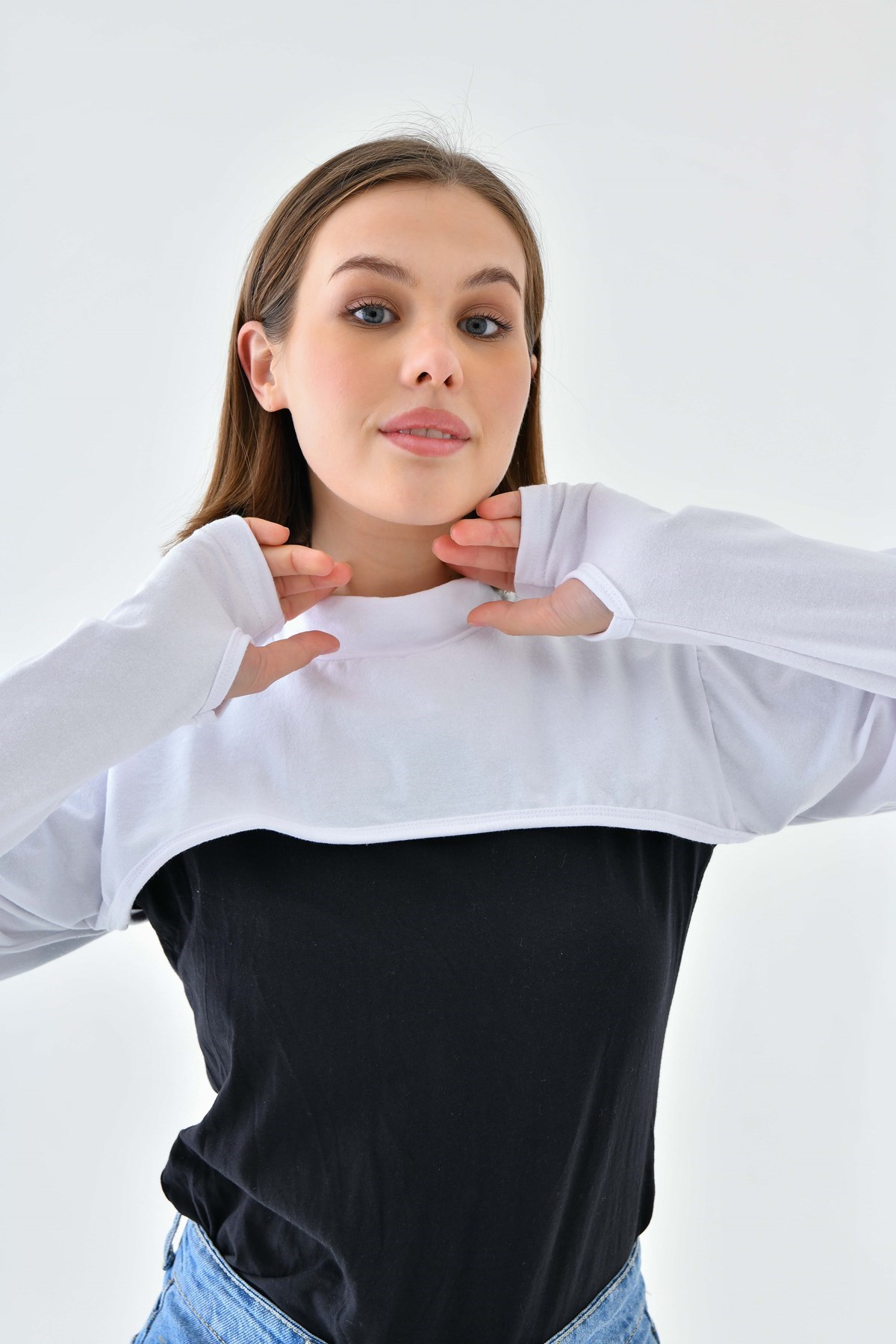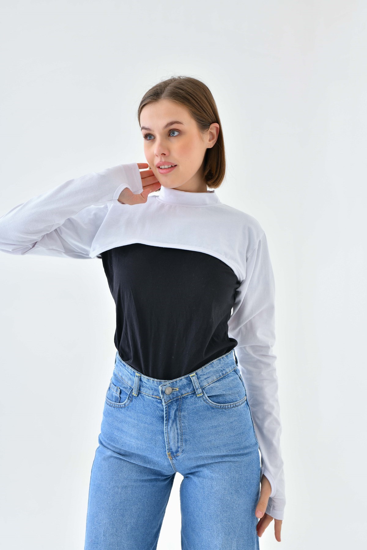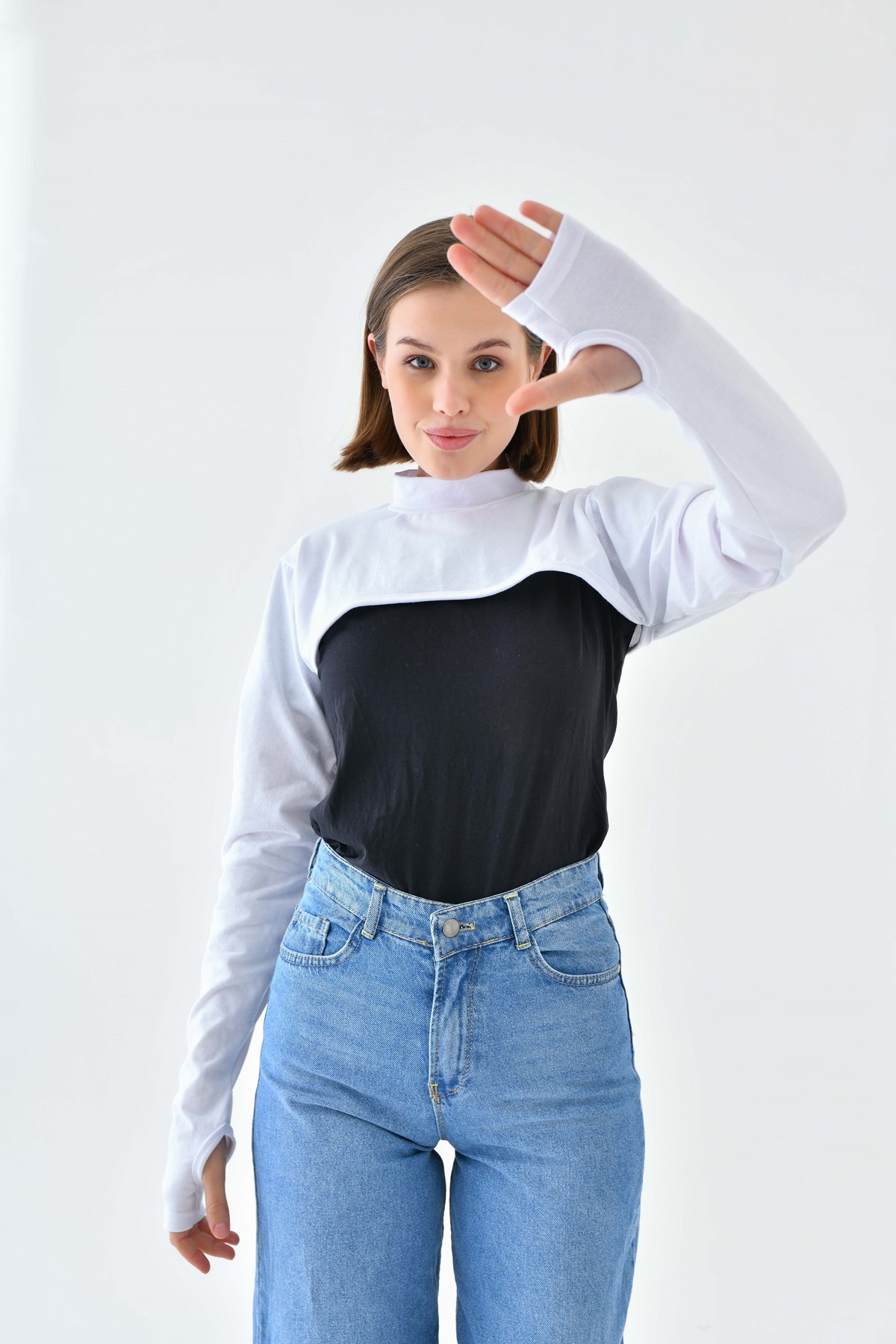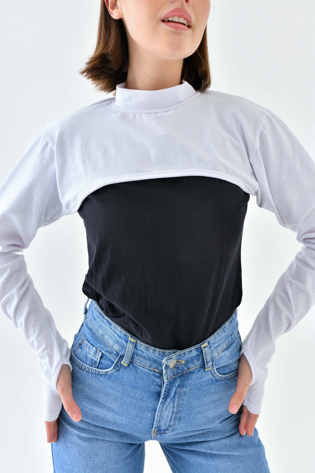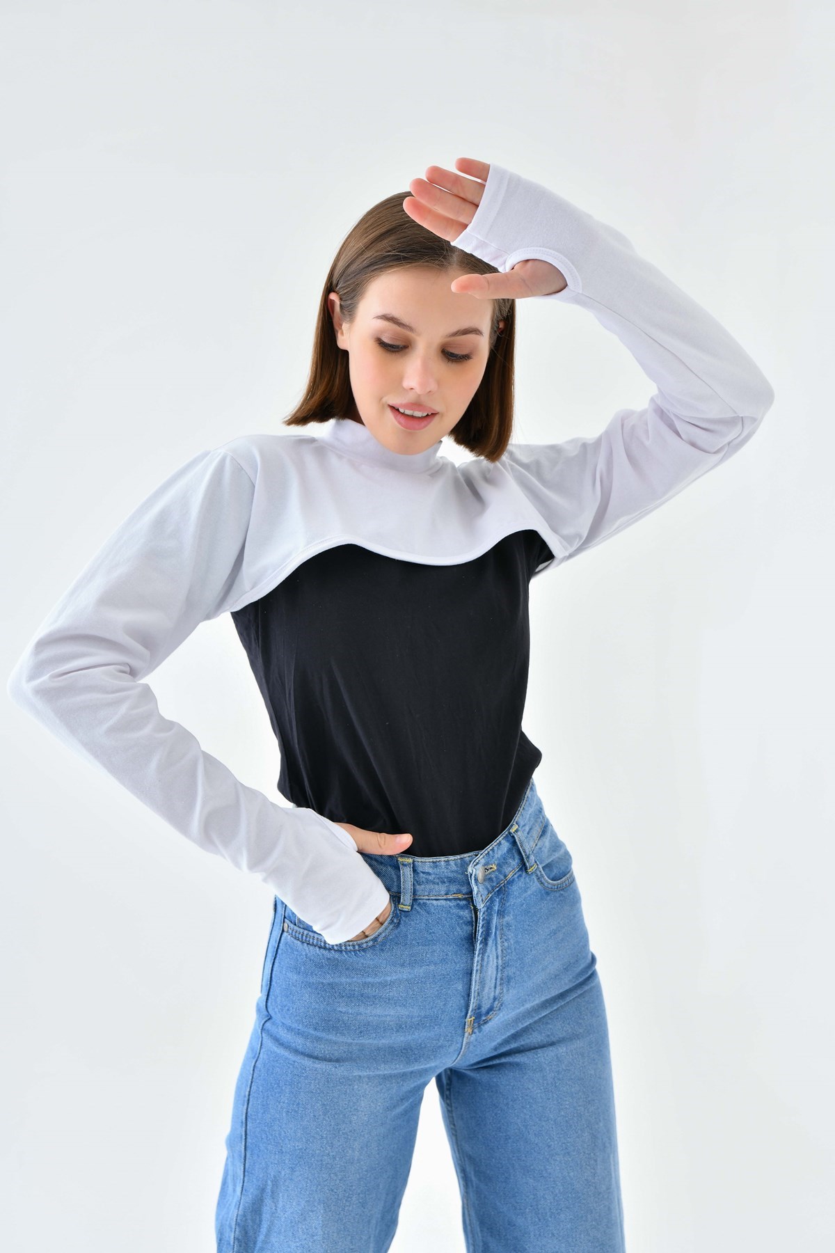 Beyaz Yüksek Kaliteli Parmak Detaylı İslami Kol Balıkçı Yaka Boyun Örtüsü, Güneş Koruyucu Kol Örtüsü, Parmaklı Kol Balıkçı Yaka Boyun Örtüsü