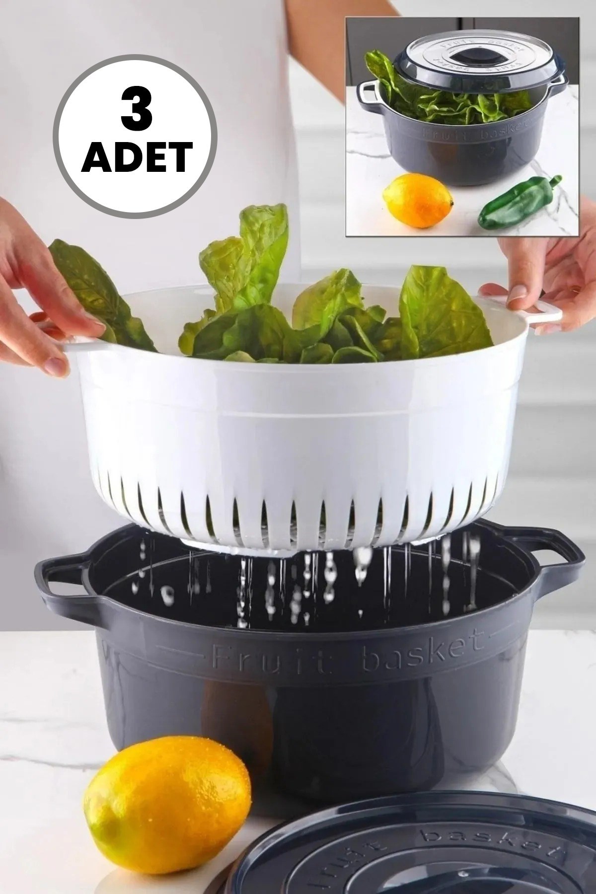 3 Adet Yuvarlak Tencere Model Süzgeçli Meyve - Sebze Saklama Kabı Buzdolabı Organizeri