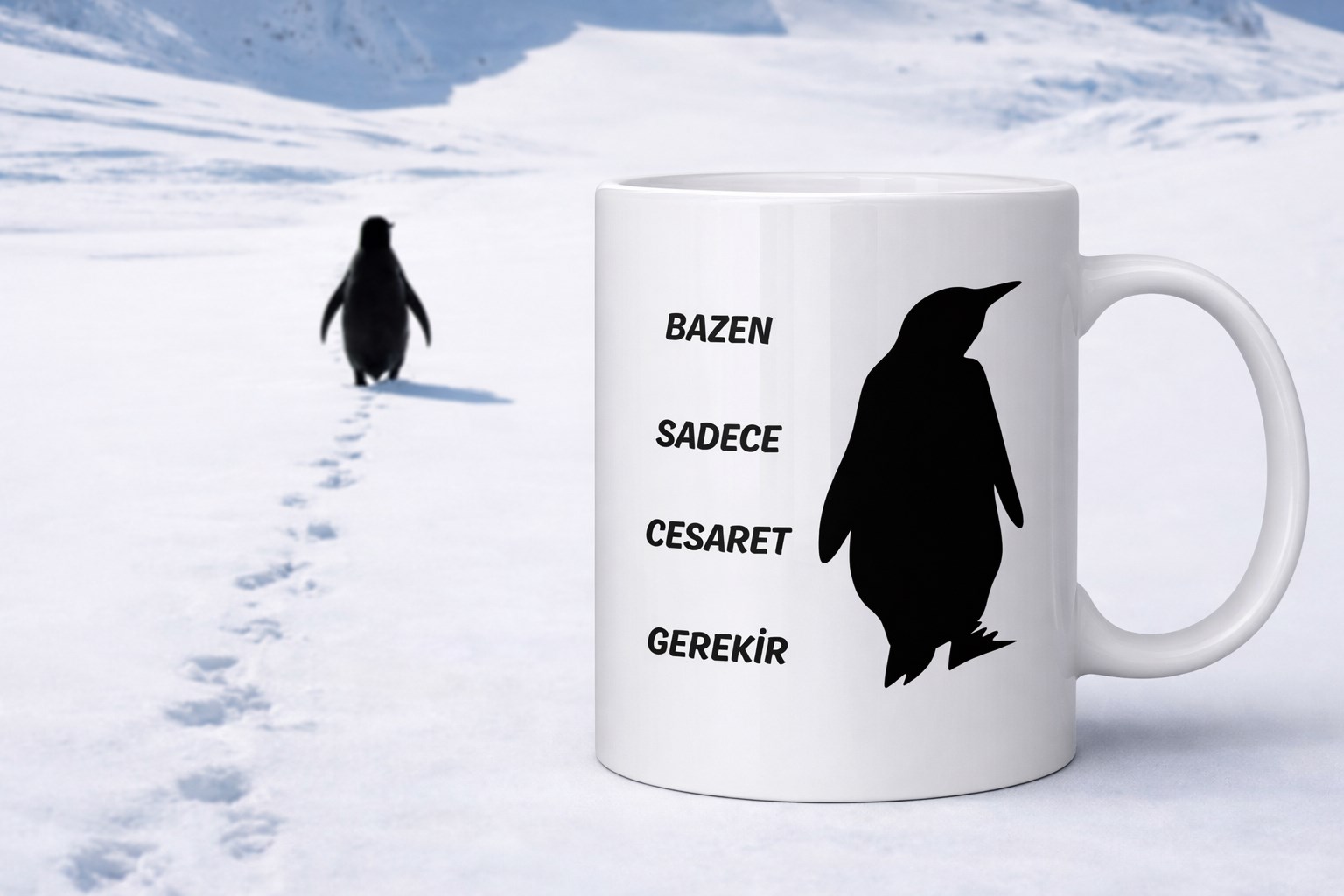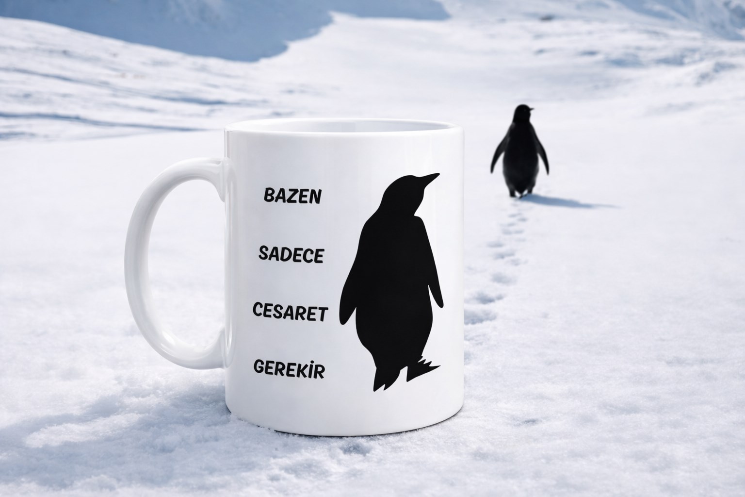 Üzerindeki Nihilist Penguen, sürüden ayrılıp dağa doğru yürüyen bir karakteri temsil eder.