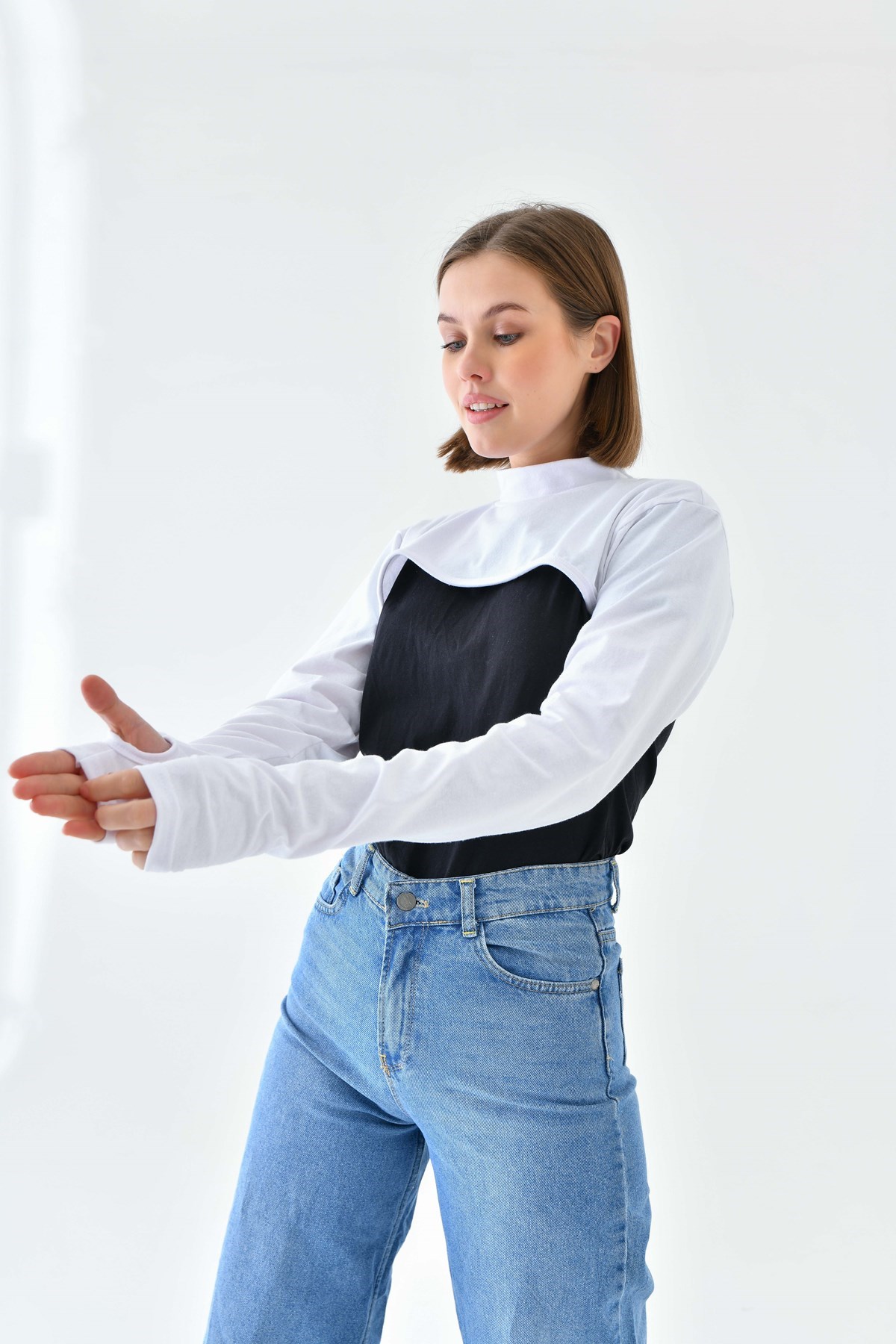 Balıkçı Yaka Parmak Detaylı Boyunluklu Kolluk - Beyaz