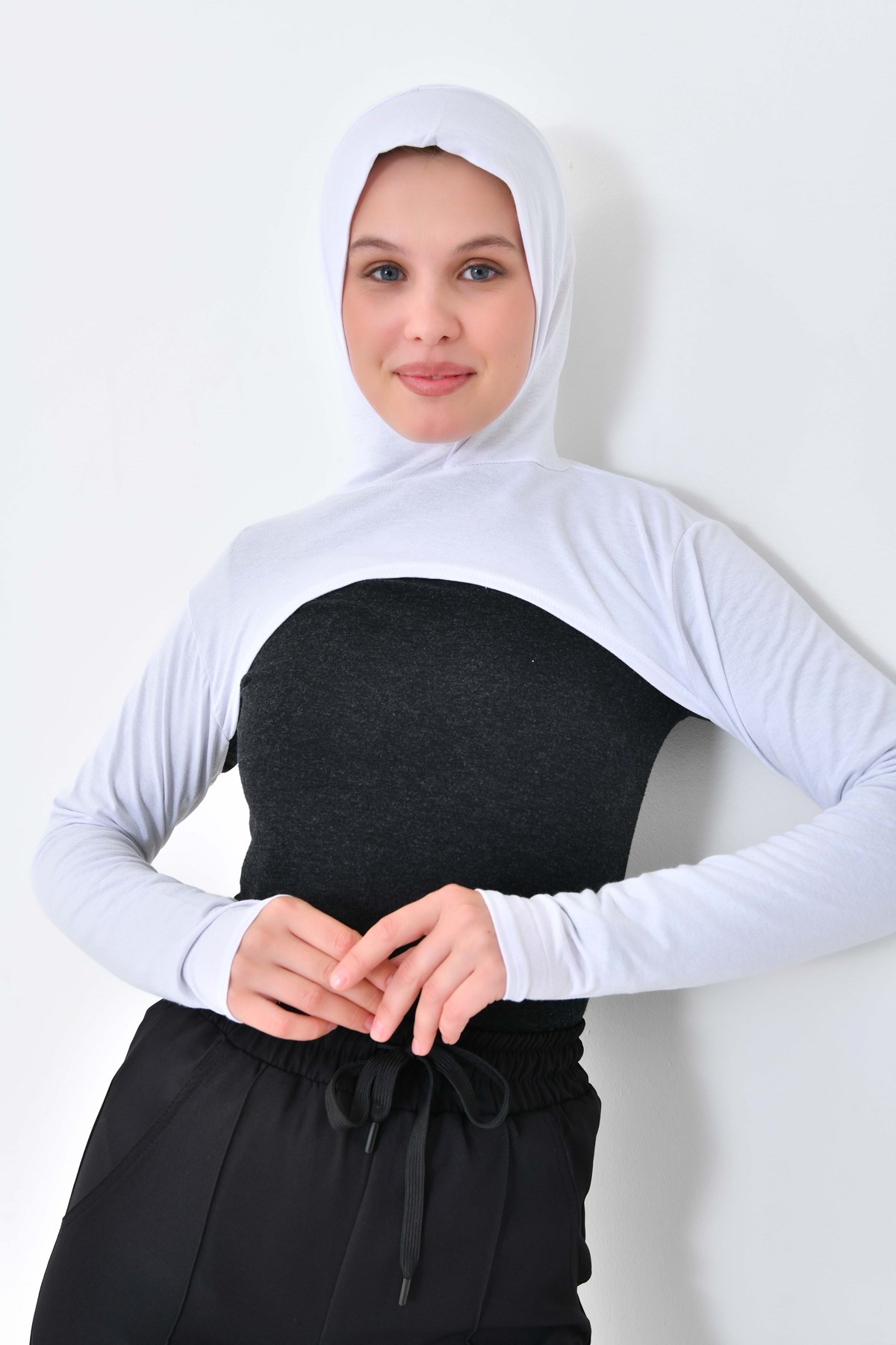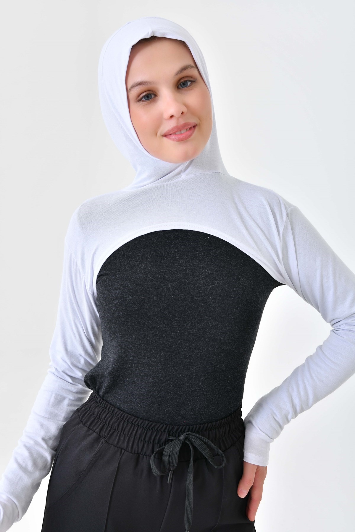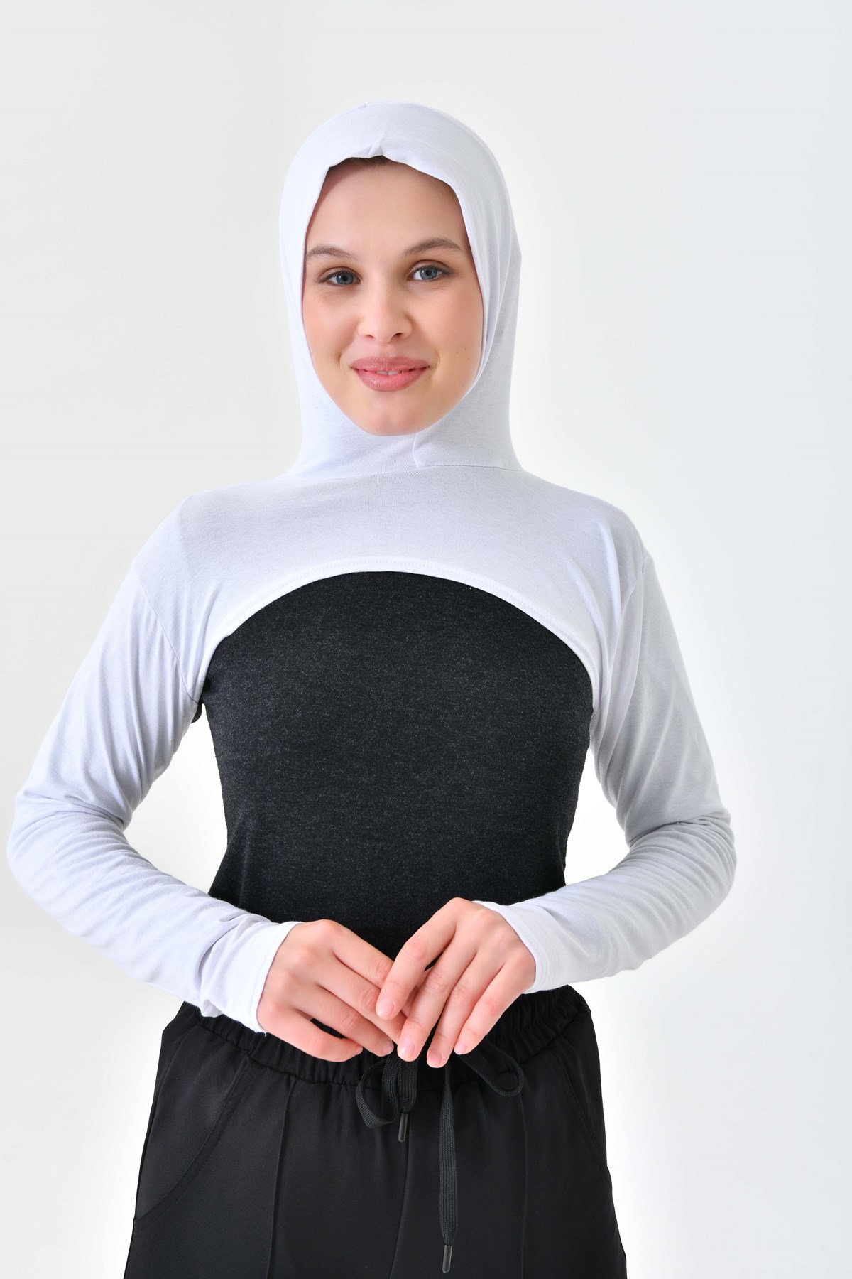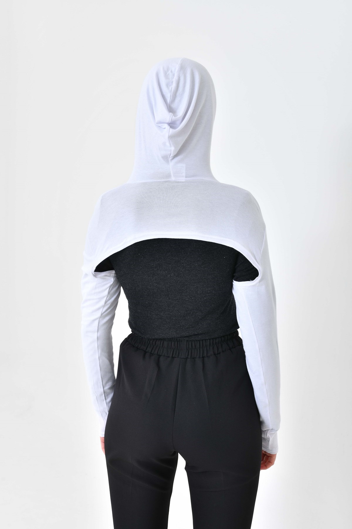 Beyaz Yüksek Kaliteli Boneli Tesettür Boyunluklu Kolluk, Güneş Koruyucu Kol Örtüsü, Kapüşonlu Boyun Örtüsü, Bolero, Kapüşonlu Crop Bluz