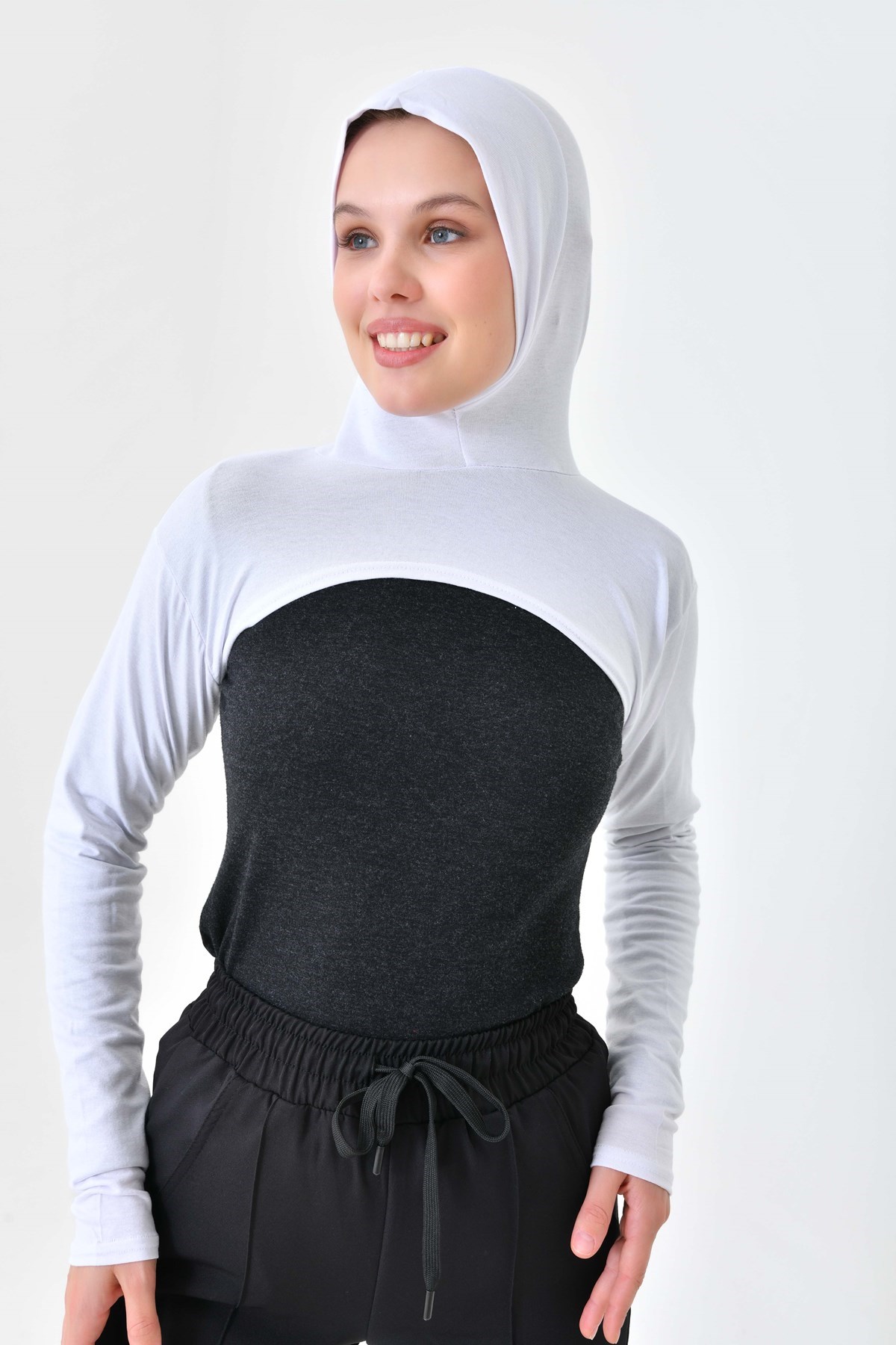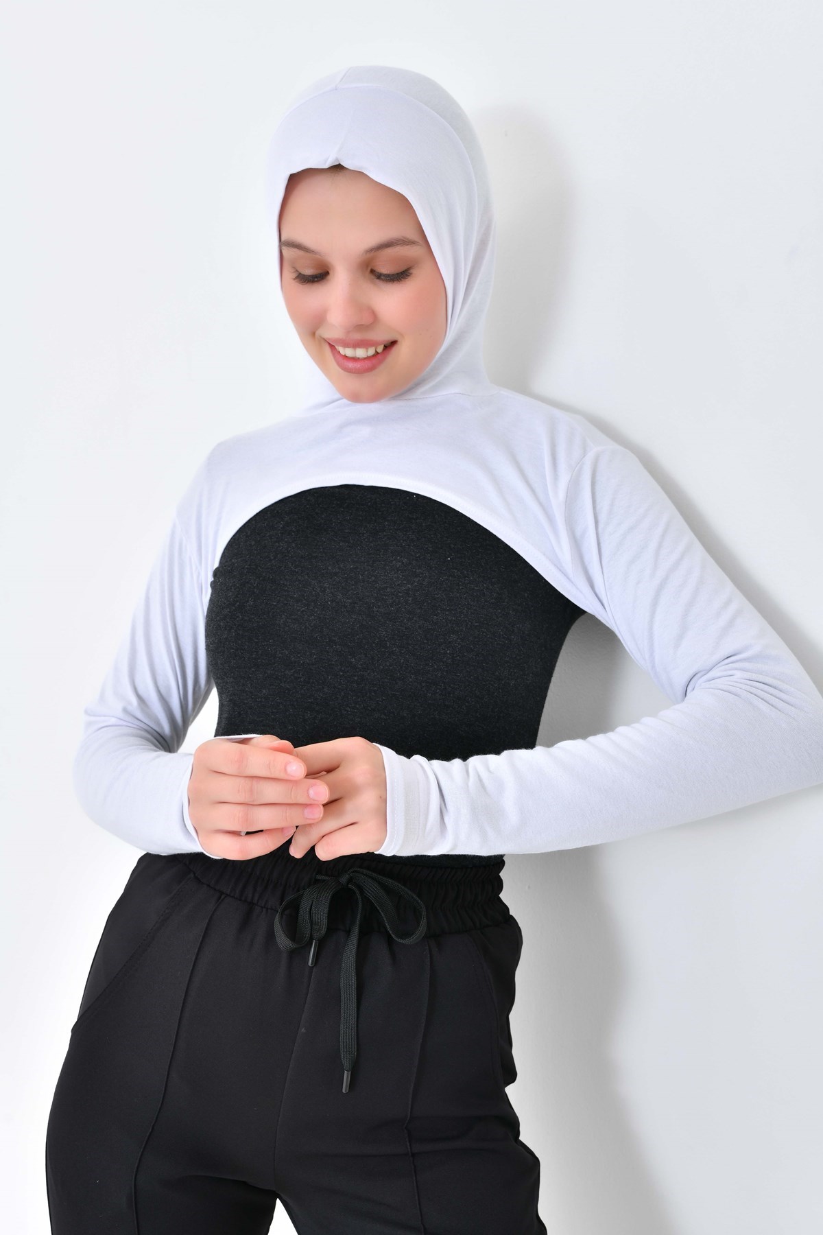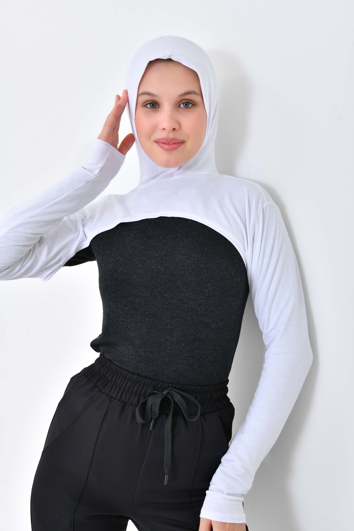 Beyaz Yüksek Kaliteli Boneli Tesettür Boyunluklu Kolluk, Güneş Koruyucu Kol Örtüsü, Kapüşonlu Boyun Örtüsü, Bolero, Kapüşonlu Crop Bluz