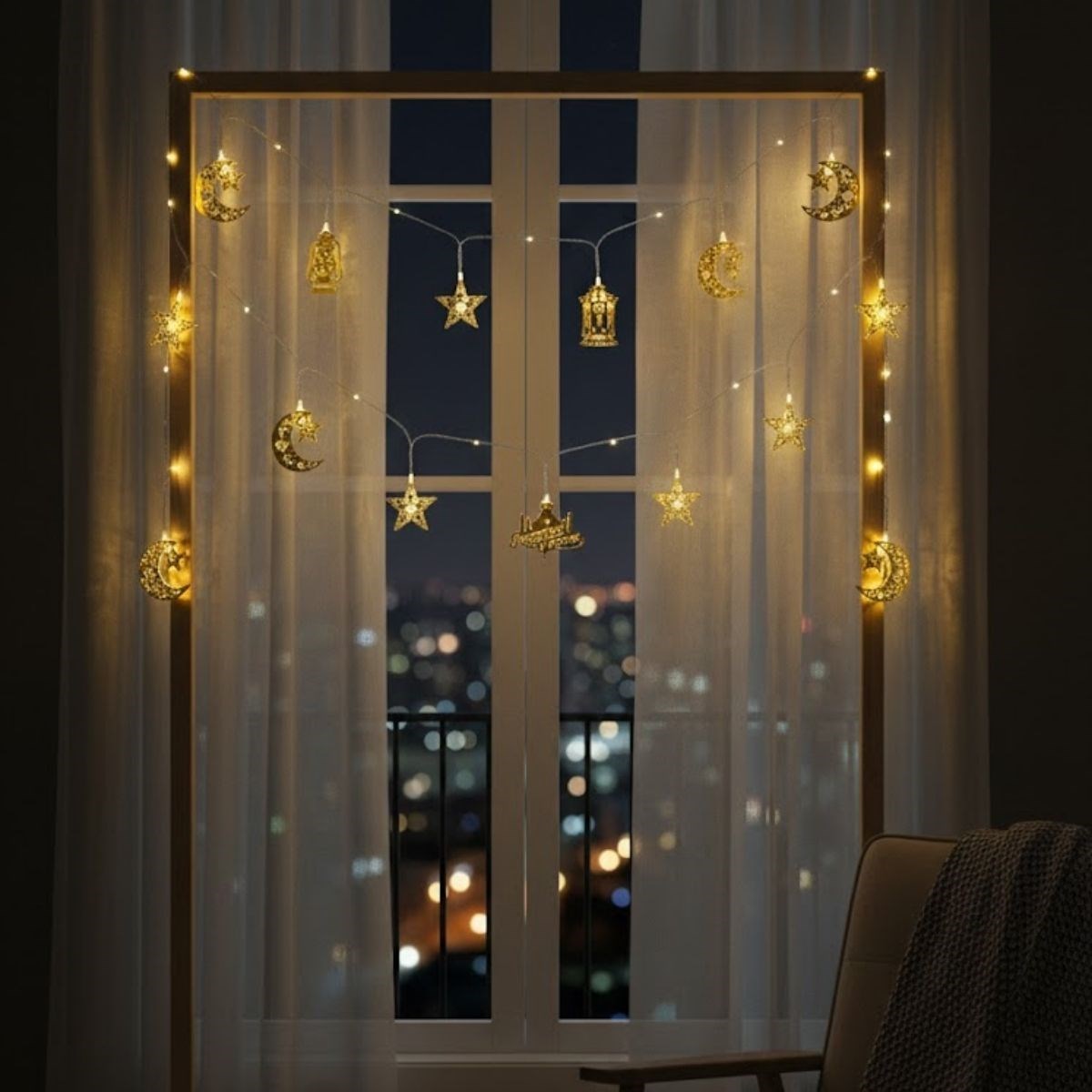 2 metre uzunluğa sahip bu dekoratif Ramazan süsü, pilli yapısı sayesinde priz ihtiyacı olmadan kolayca kullanılabilir. Kablolu karmaşa olmadan istenilen her alana rahatça asılabilir; salon, oturma odası, çocuk odası, vitrin, pencere, duvar ve masa üstü süslemelerinde güvenle tercih edilebilir. Günışığı tonundaki LED’ler göz yormayan bir aydınlatma sunarak Ramazan akşamlarına sıcak ve davetkâr bir ambiyans katar.