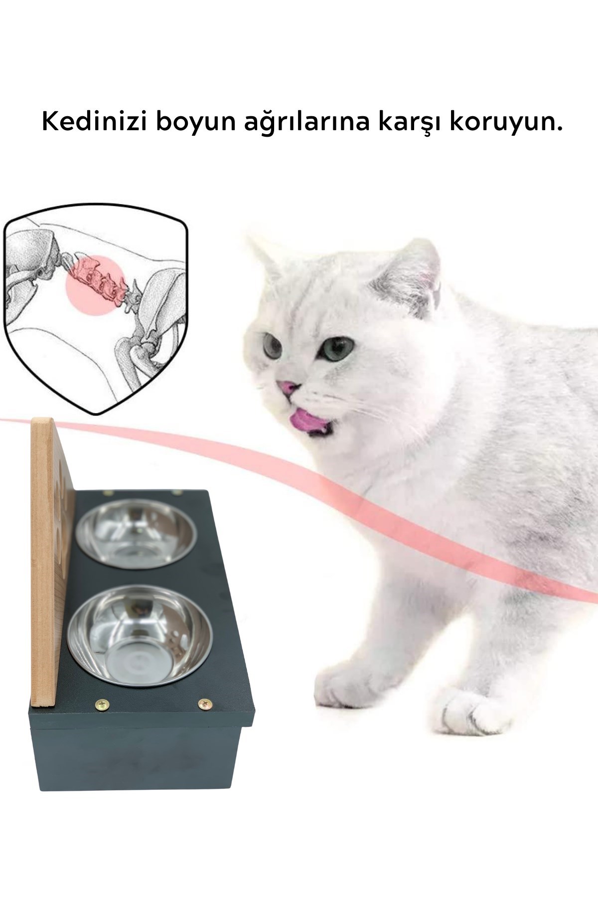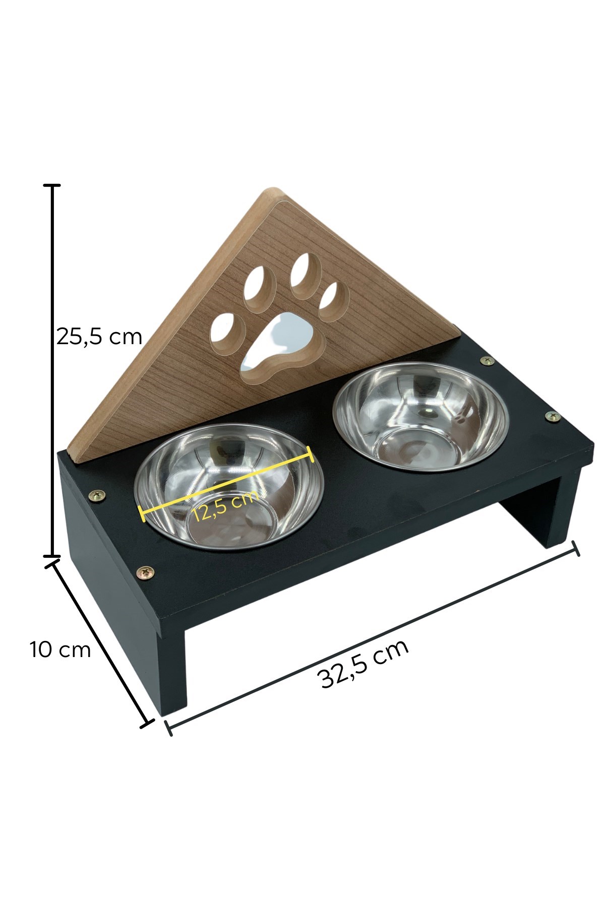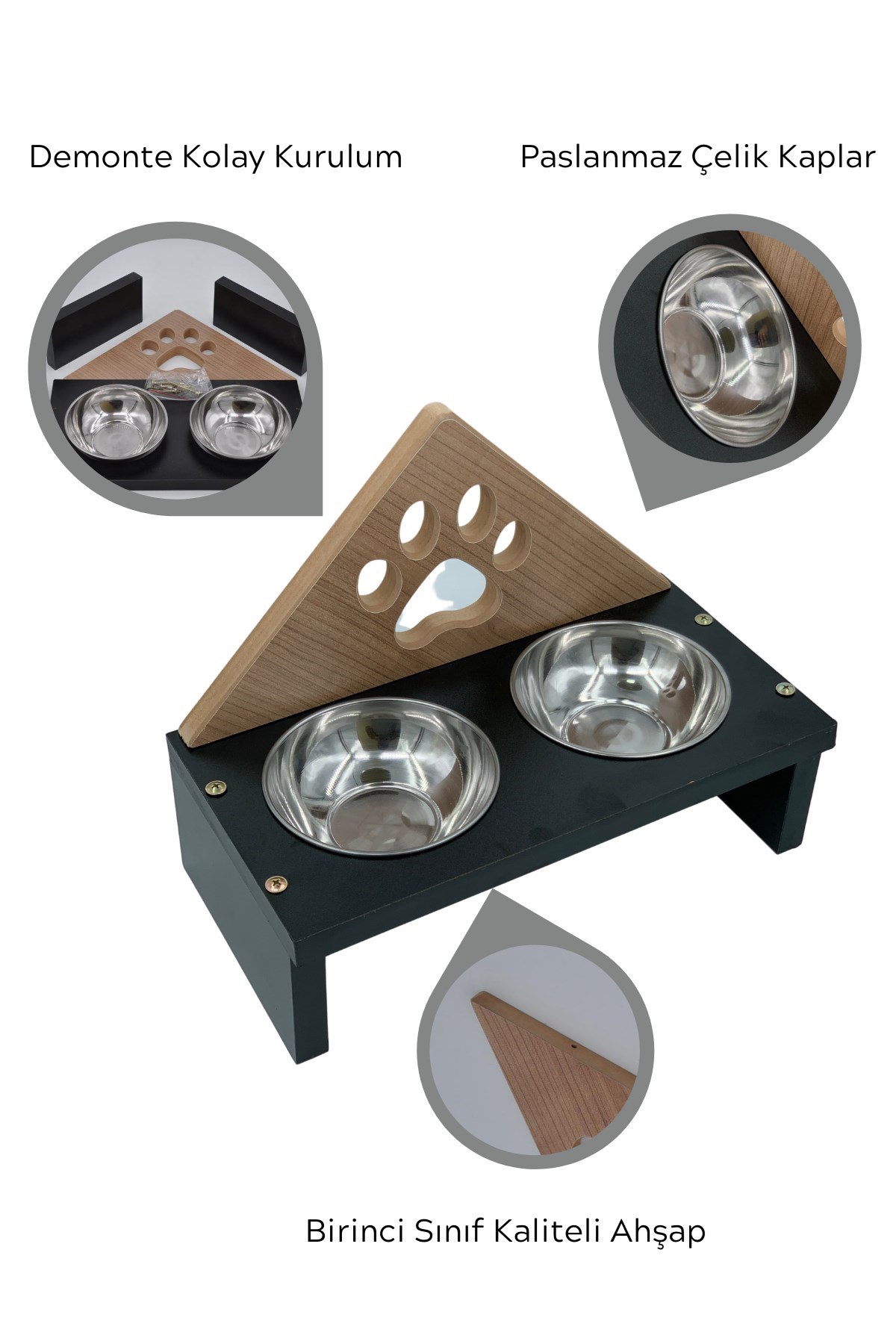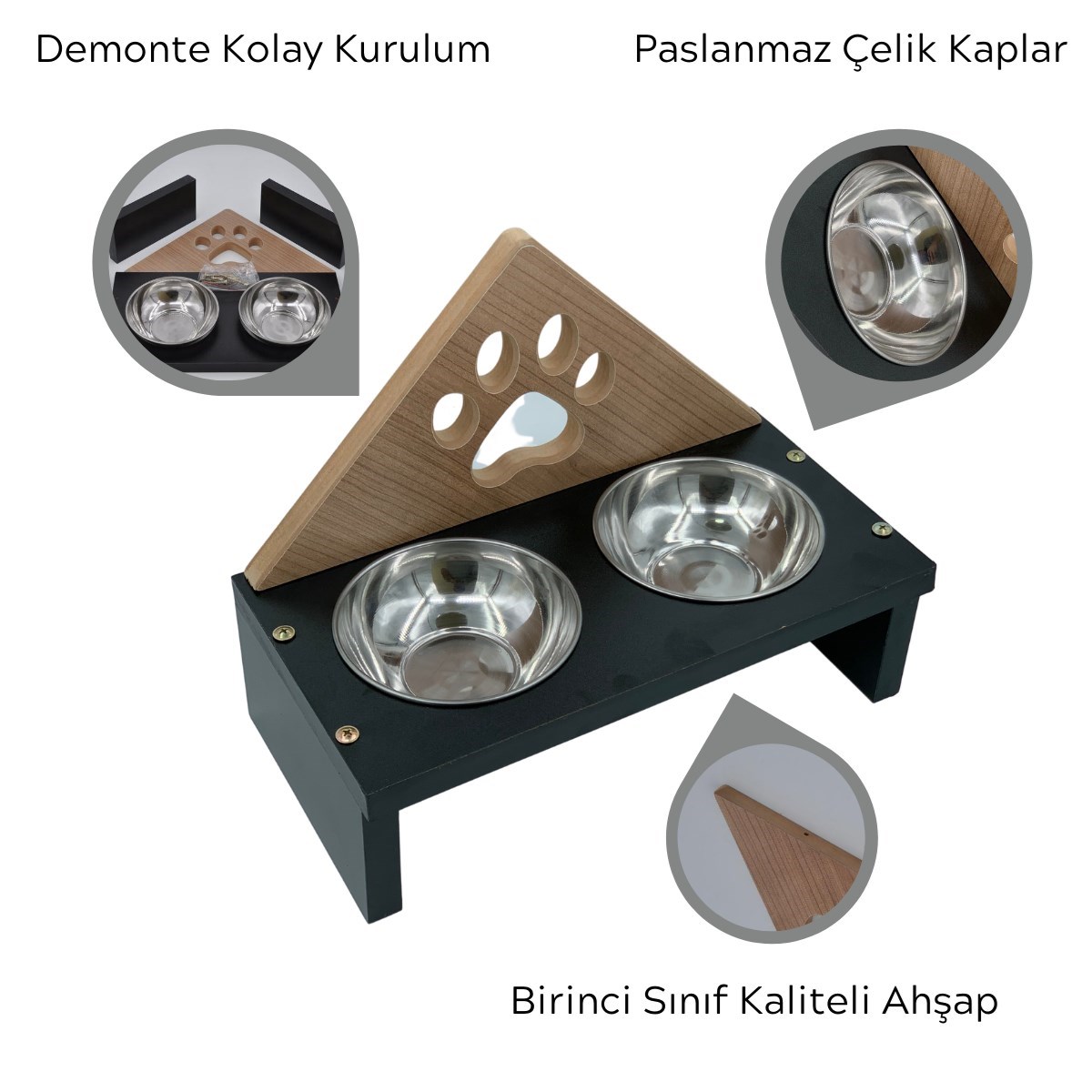 BUFFER® Ahşap Paslanmaz Çelik Kedi Köpek Toz Hazneli 2li Demonte Stand Metal Mama ve Su Kabı Kutusu