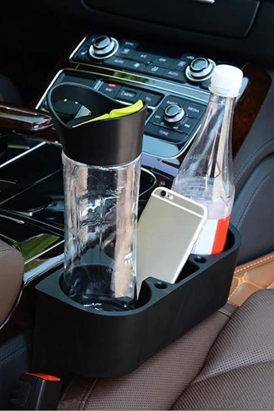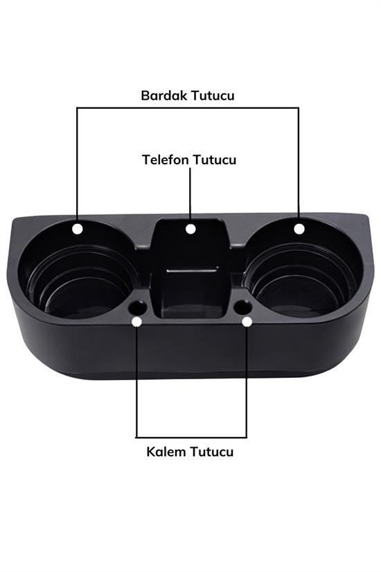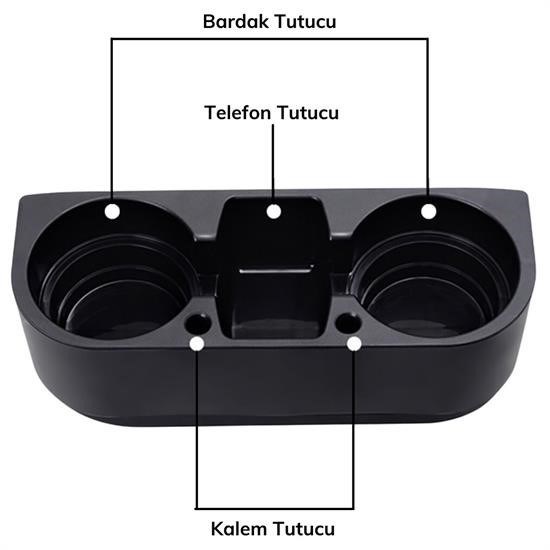Ergonomik tasarımlı Araç İçi Koltuk Arası Bardaklık ürünüyle su şişesi, 2 bölmeli kutu içecek, cep telefonu, bozuk para, anahtarlık, kağıt havlu, kalem, not defteri gibi eşyalarınızı bir arada tutabilirsiniz