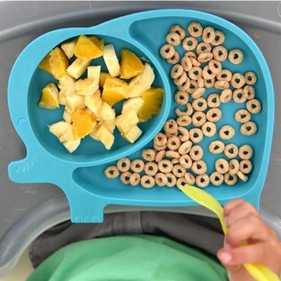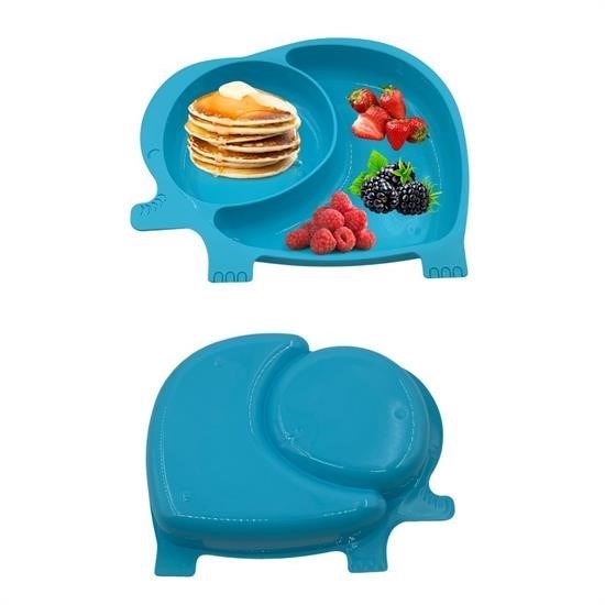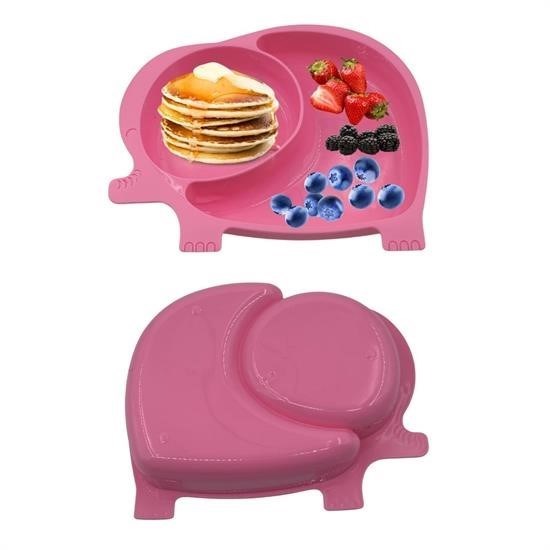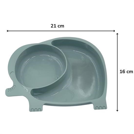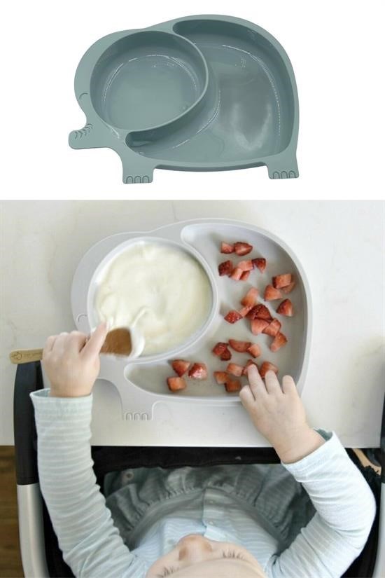 Fil desenli mama kabında bölme olması bebeklerin farklı çeşit yemekleri aynı anda yemesine olanak sağlar