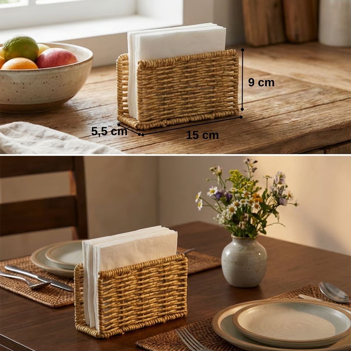 BUFFER® Dekoratif Plastik Rattan Dikdörtgen Peçetelik, doğal hasır dokusundan ilham alan estetik tasarımıyla masaüstü düzenine şıklık kazandırır. Dayanıklı plastik rattan malzemeden üretilmiş olup, uzun ömürlü kullanım ve kolay temizlik avantajı sunar.