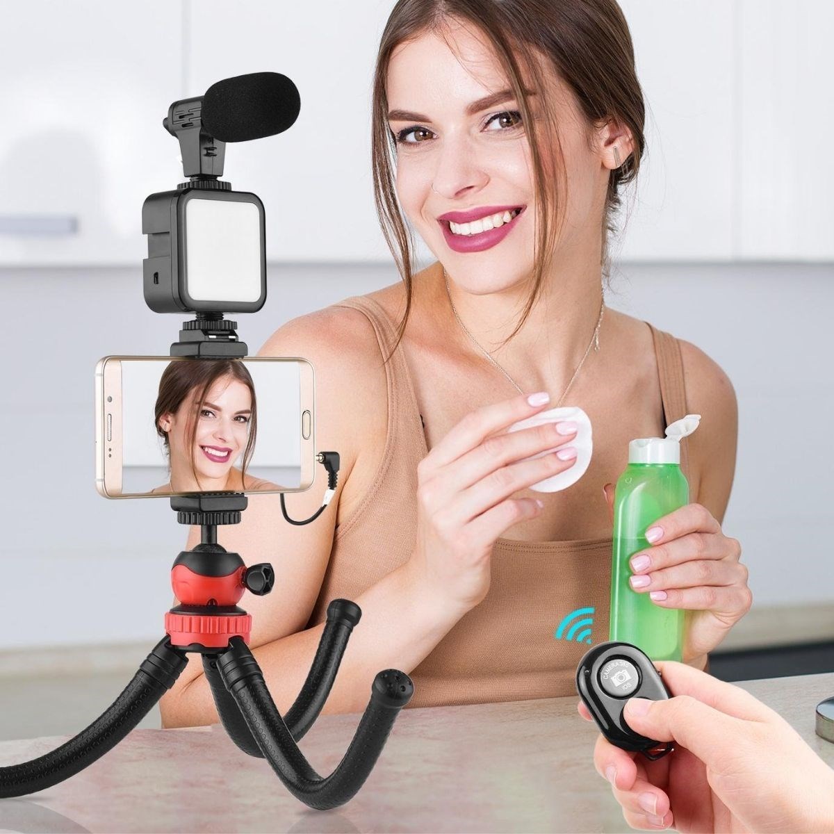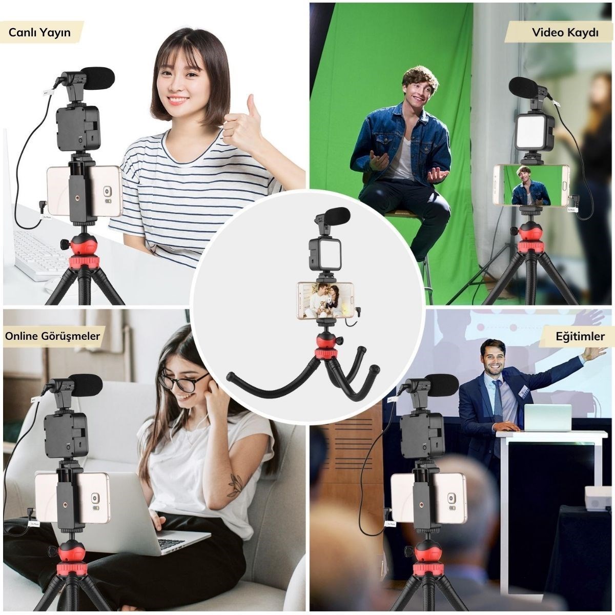BUFFER® Esnek Tripod Stüdyo Işıklı Mikrofonlu Telefon Kamera Uyumlu Vlog Kiti Video Canlı Yayın Dış Mekan Çekimi Montaj Kiti