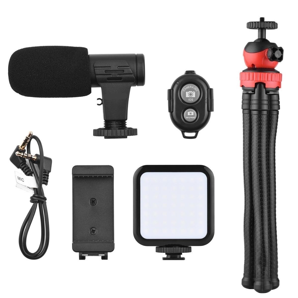 Çekim Video Kiti mikrofon, 3 renkli abajur ile stüdyo lambası, telefon klipsli mini tripod, kullanım kılavuzu ve 2 kablo, biri kamera için, biri akıllı telefon için tasarlanmıştır