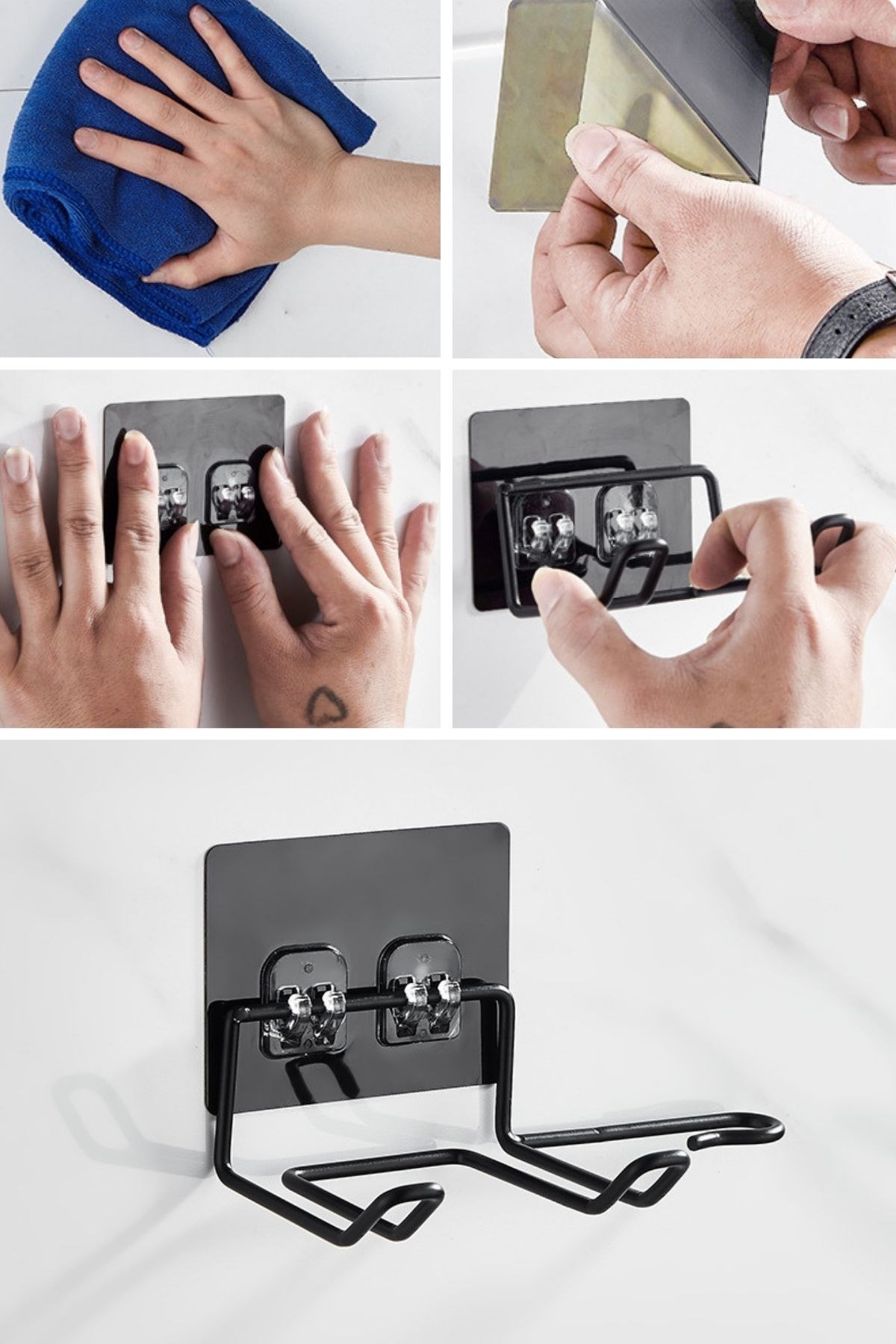Çeşitli Kullanım Alanları: Bu siyah yapışkanlı fön makine tutucu sadece banyolarda değil, aynı zamanda makyaj masalarında veya diğer uygun yüzeylerde de kullanılabilir. Küçük boyutu ve hafif yapısı sayesinde taşıması kolaydır ve seyahatlerde de rahatlıkla kullanılabilir.