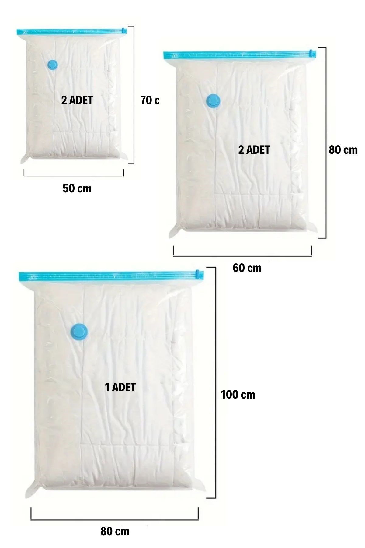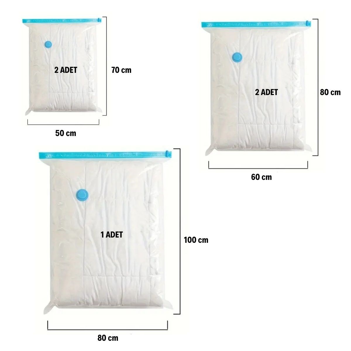 BUFFER® Giysi İçin Vakumlu Saklama Torbaları 5'li Vakumlu Hurç, eşyalarınızı düzenli ve yer tasarruflu bir şekilde saklamanızı sağlayan ideal bir çözümdür. Vakumlu yapısıyla dolaplarınızda ve bavullarınızda %75’e kadar daha fazla yer açarken, giysilerinizi toz, nem, koku ve böceklerden korur. Seyahatlerde, mevsim değişimlerinde ve uzun süreli saklamalarda kullanım için idealdir.