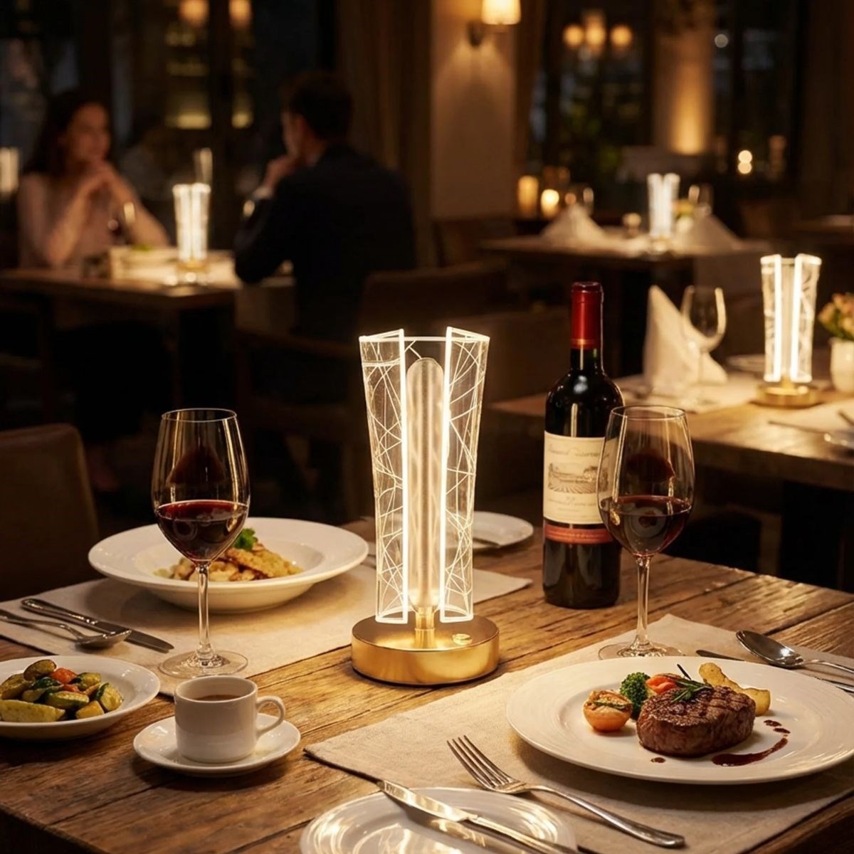 Kristal yüzey üzerindeki geometrik çizgi desenleri, LED ışık ile birleşerek ortama etkileyici bir yansıma ve modern bir ambiyans oluşturur. Silindirik ve ince yapısı sayesinde masaüstünde minimal alan kaplarken güçlü bir dekoratif etki sağlar.