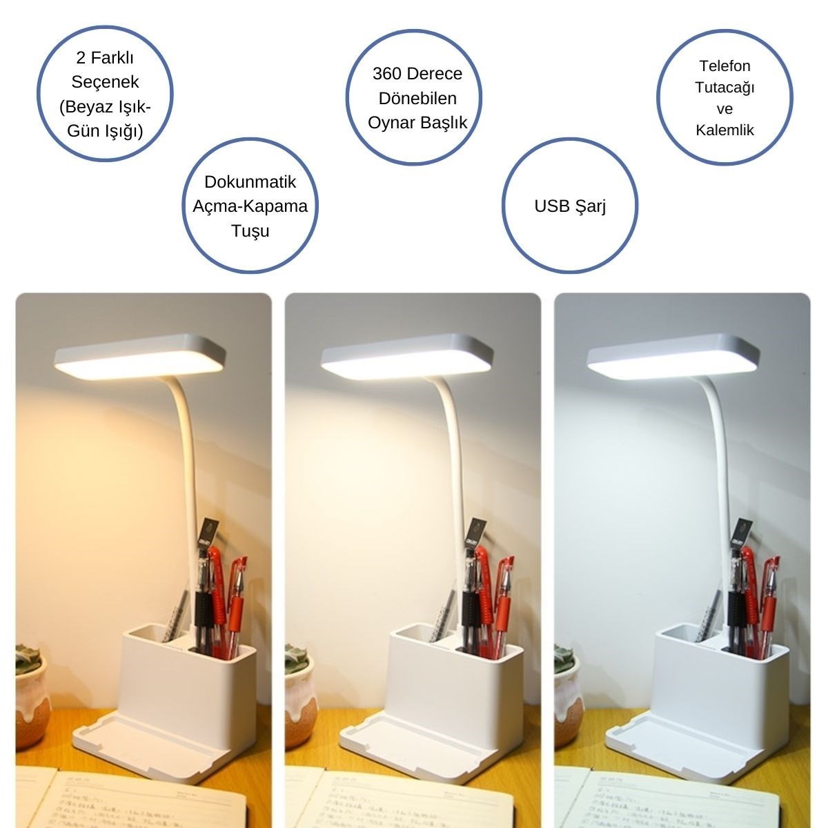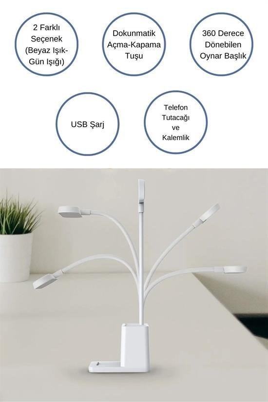 BUFFER® Kalemlikli USB Şarjlı Dokunmatik 3 Kademeli 360 Derece Dönebilen Özel Göz Korumalı led Lityum Masa Lambası