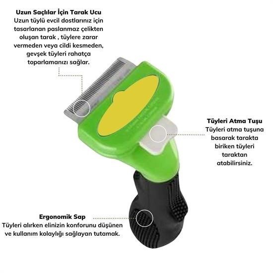Buffer Kedi ve Köpekler İçin Uzun Tüylü Köpek Tarağı uzun tüylü köpekler ve kediler için tasarlanmıştır Üzerinde bulunan tuşu sayesinde tarakta biriken tüyleri tuşa basatak kolayca tarak üzerinden atabilirsiniz