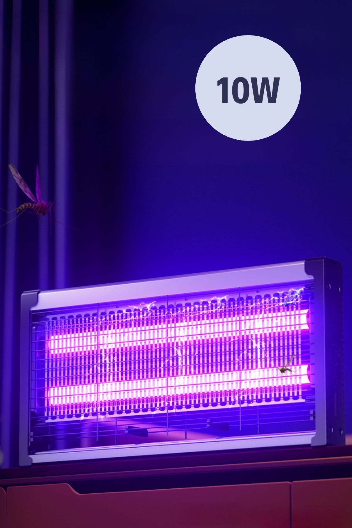 Masaüstü veya Duvara Asılabilen 10W Uzun Enli Sessiz Sinek Öldürücü UV Mor Işıklı Makina, ev, ofis, restoran ve bahçeler gibi iç ve dış mekanlarda sinek ve sivrisinek gibi rahatsız edici böcekleri etkili bir şekilde yok eder. UV mor ışık teknolojisi sayesinde böcekleri çeker ve güvenli bir şekilde yakalar.