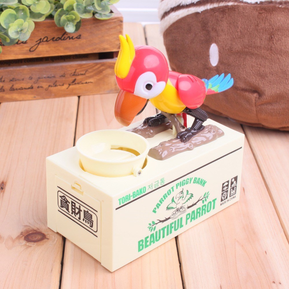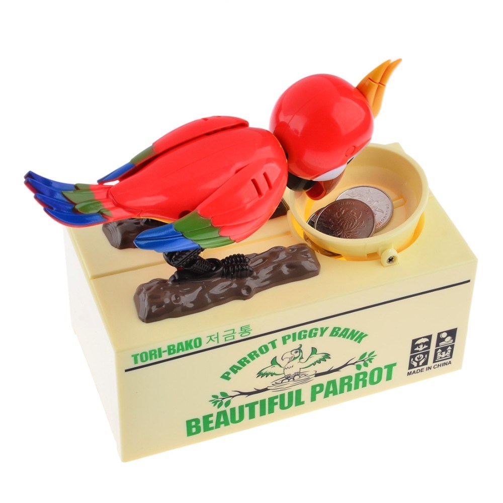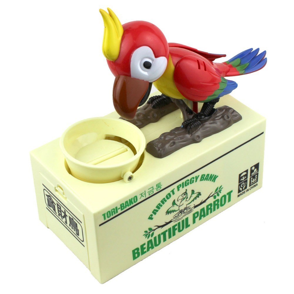 Bozuk paralarınızı koyacak yer bulamıyor musunuz? Taliplisi var: Para Yiyen Kuş Kumbara Parrot Piggy Bank Bozuk parayı çok seven bir kuş önündeki mama kabına bozuklukları atıyorsunuz, hemen kokusunu alıyor (aslında sensörü sayesinde algılıyor) ve kafasını, sağa sola oynatarak, adeta kendinden geçerek afiyetle yemeye koyuluyor Aslında başarılı olamıyor Çünkü bozuk paralar altındaki kumbara bölümünde birikiyor, yani kazanan siz oluyorsunuz Para Yiyen kuş Kumbara, çocuklarınızı para biriktirmeye teşvik eden son derece eğlenceli bir ürün
