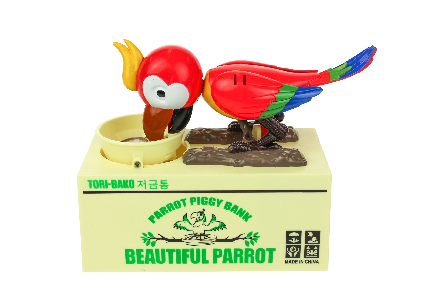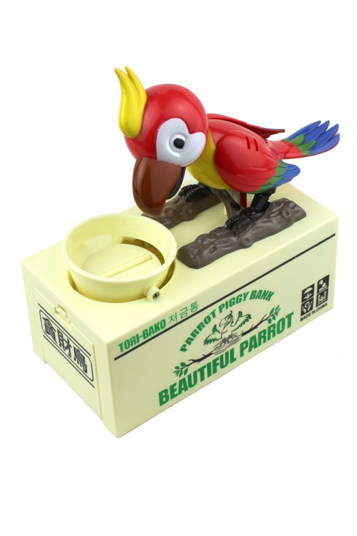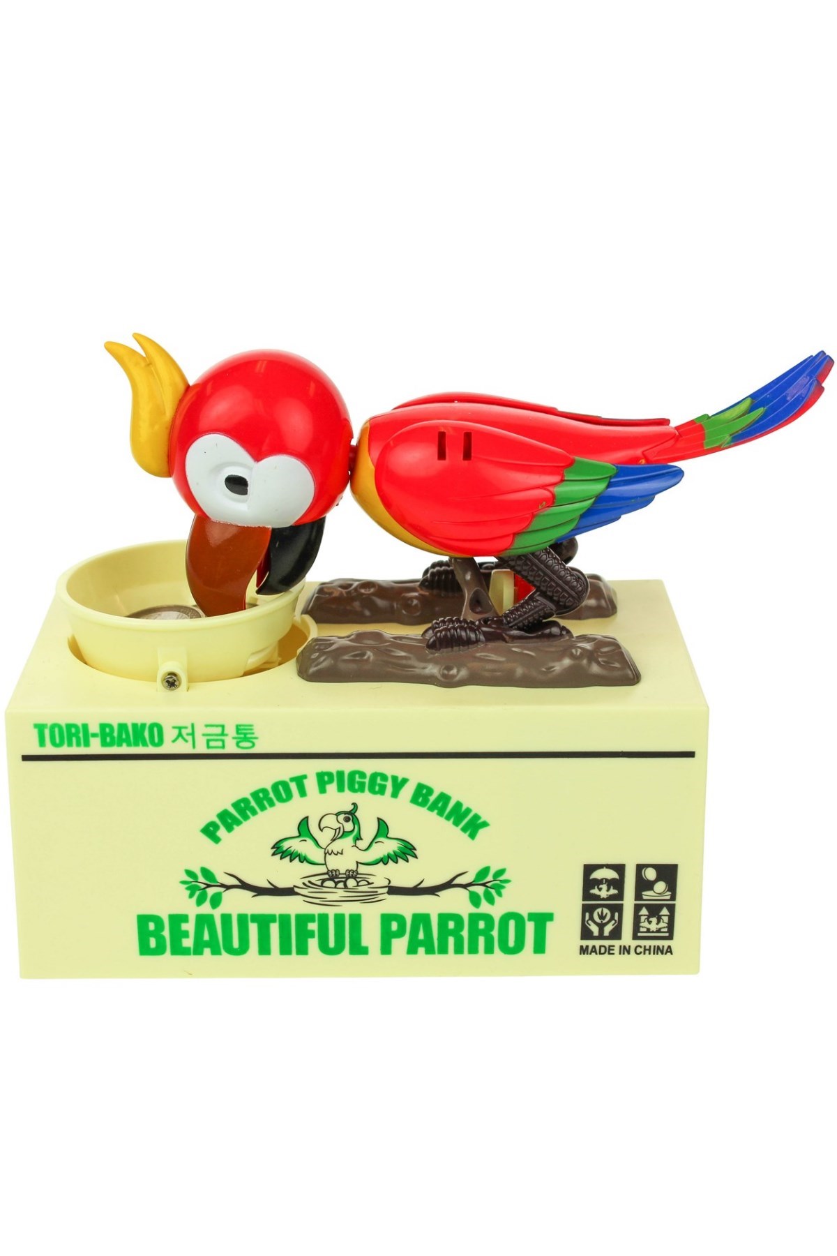 Bozuk paralarınızı koyacak yer bulamıyor musunuz? Taliplisi var: Para Yiyen Kuş Kumbara Parrot Piggy Bank Bozuk parayı çok seven bir kuş önündeki mama kabına bozuklukları atıyorsunuz, hemen kokusunu alıyor (aslında sensörü sayesinde algılıyor) ve kafasını, sağa sola oynatarak, adeta kendinden geçerek afiyetle yemeye koyuluyor Aslında başarılı olamıyor Çünkü bozuk paralar altındaki kumbara bölümünde birikiyor, yani kazanan siz oluyorsunuz Para Yiyen kuş Kumbara, çocuklarınızı para biriktirmeye teşvik eden son derece eğlenceli bir ürün