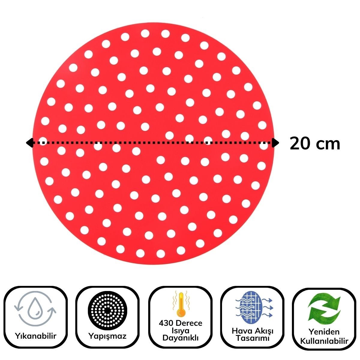 Slikon pişirme matı 20 cm uzunluğunda ve yuvarlak yapıdadır. Kırmızı ve siyah olmak üzere 2 farklı rengi bulunur. Delikli yapısı sayesinde yemeğiniz pişerken aşırı kokuyu önler.