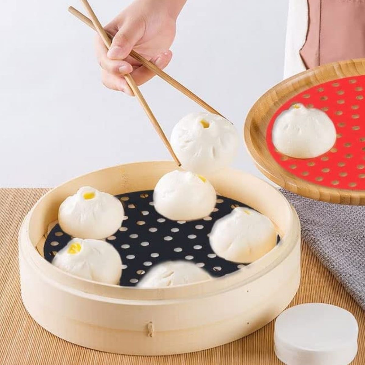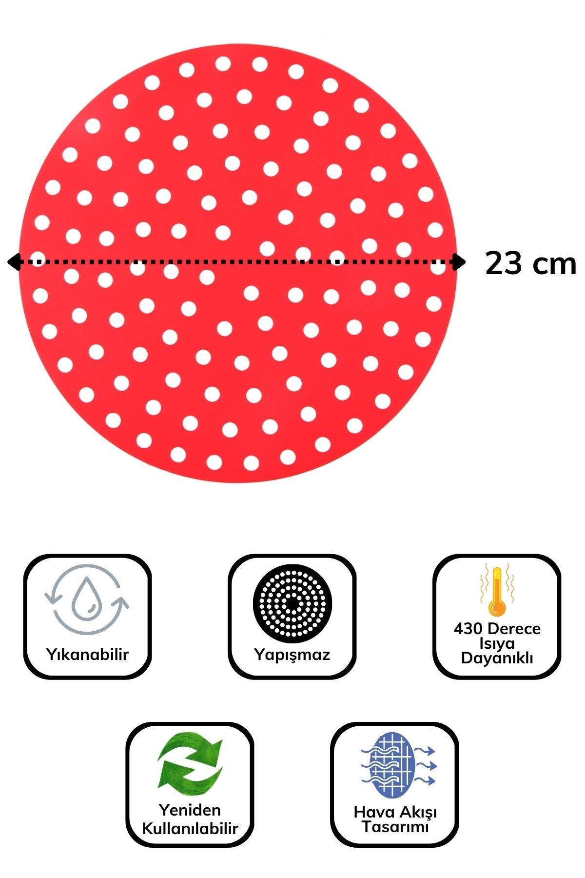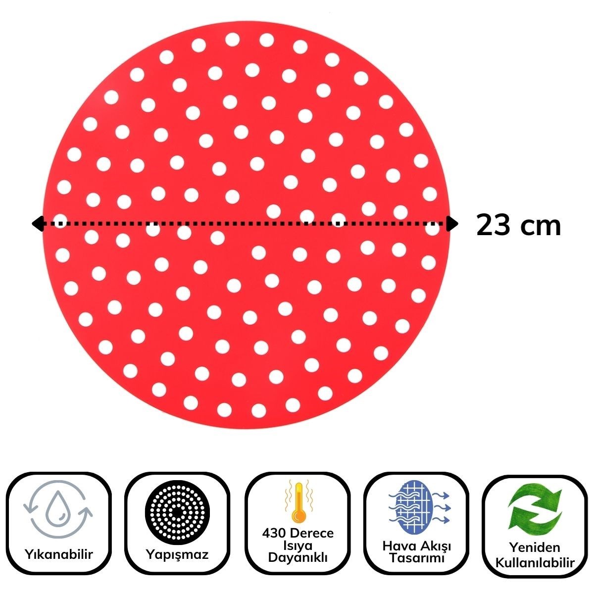 Slikon pişirme matı 23 cm uzunluğunda ve yuvarlak yapıdadır. Kırmızı ve siyah olmak üzere 2 farklı rengi bulunur. Delikli yapısı sayesinde yemeğiniz pişerken aşırı kokuyu önler.