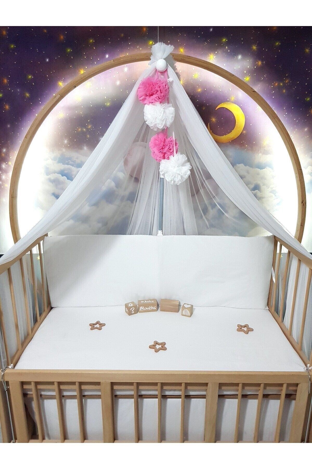Koyu Pembe Ponponlu Bebek Lüks Cibinlik Takımı - Dört Ponponlu 6 Metre Beyaz Likra Tül (Cibinlik Aparatı Dahil)