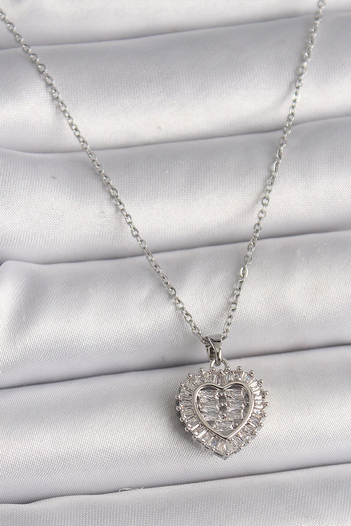 316L Çelik Gümüş Renk Zincir Zirkon Taşlı Kalp Model Kadın Kolye