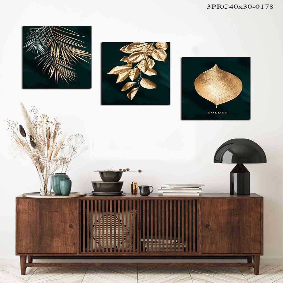 3 Parça Gold Yaprak Mdf Tablo - 3Prcy40X30-0178 40X30