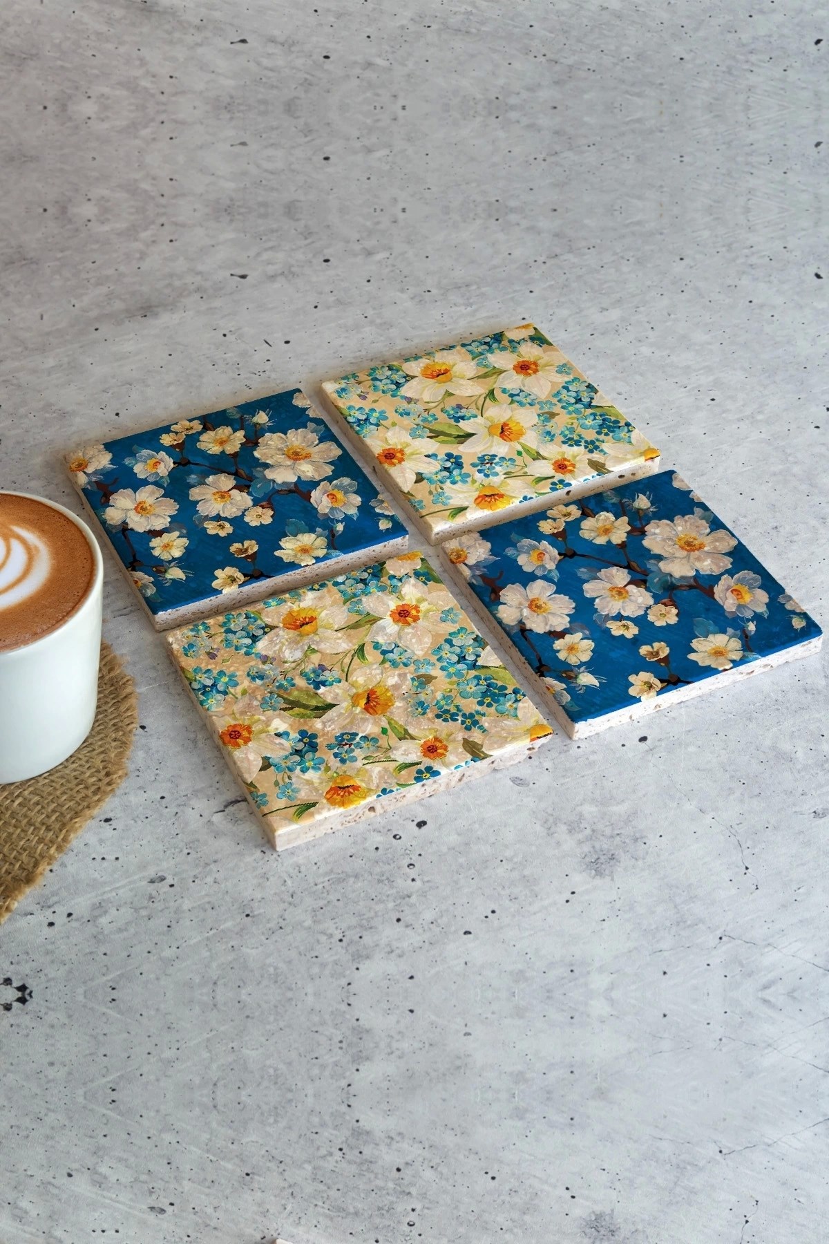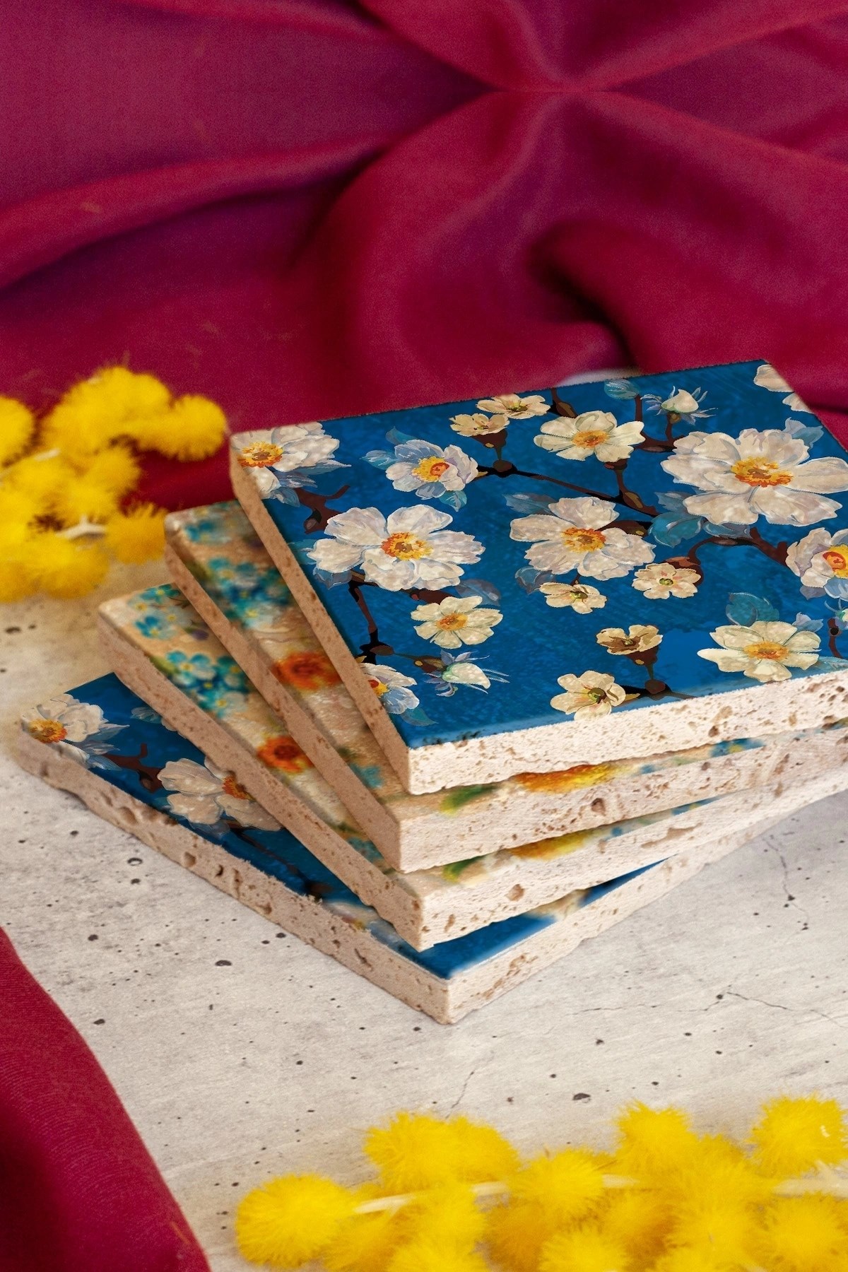 4'lü set olarak gönderilir. Her bir taş 10cm x10 cm ebatındadır.; Taş Bardak Altlıklarının her birinin arkasında koruyucu bulunmaktadır. Çizilmelere karşı korunaklıdır.; Kullanılan malzeme dağlardan çıkan gerçek taş olduğu için taşın yüzeyinde belli oranda gözenek bulunabilir ve girinti-çıkıntı olabilir.; Taşın doğal halinde krem rengi tonların bulunmasından dolayı ürün görselinde renk tonu farklılıkları olabilir.; Taşların yüzeyinde özel bir baskı yöntemi kullanılmaktadır.; Kimyasal malzeme teması yüzeyde deformasyona neden olabilir. Bu nedenle ürünler nemli bezle silinerek temizlenmelidir.; Bardak Altlıklarımızın üretimi kendi atölyemizde tarafımızca gerçekleştirilmektedir.; Özenle ambalajlanan ürünlerimiz, sorunsuz biçimde size ulaştırılmak üzere kargolanması yapılır.;