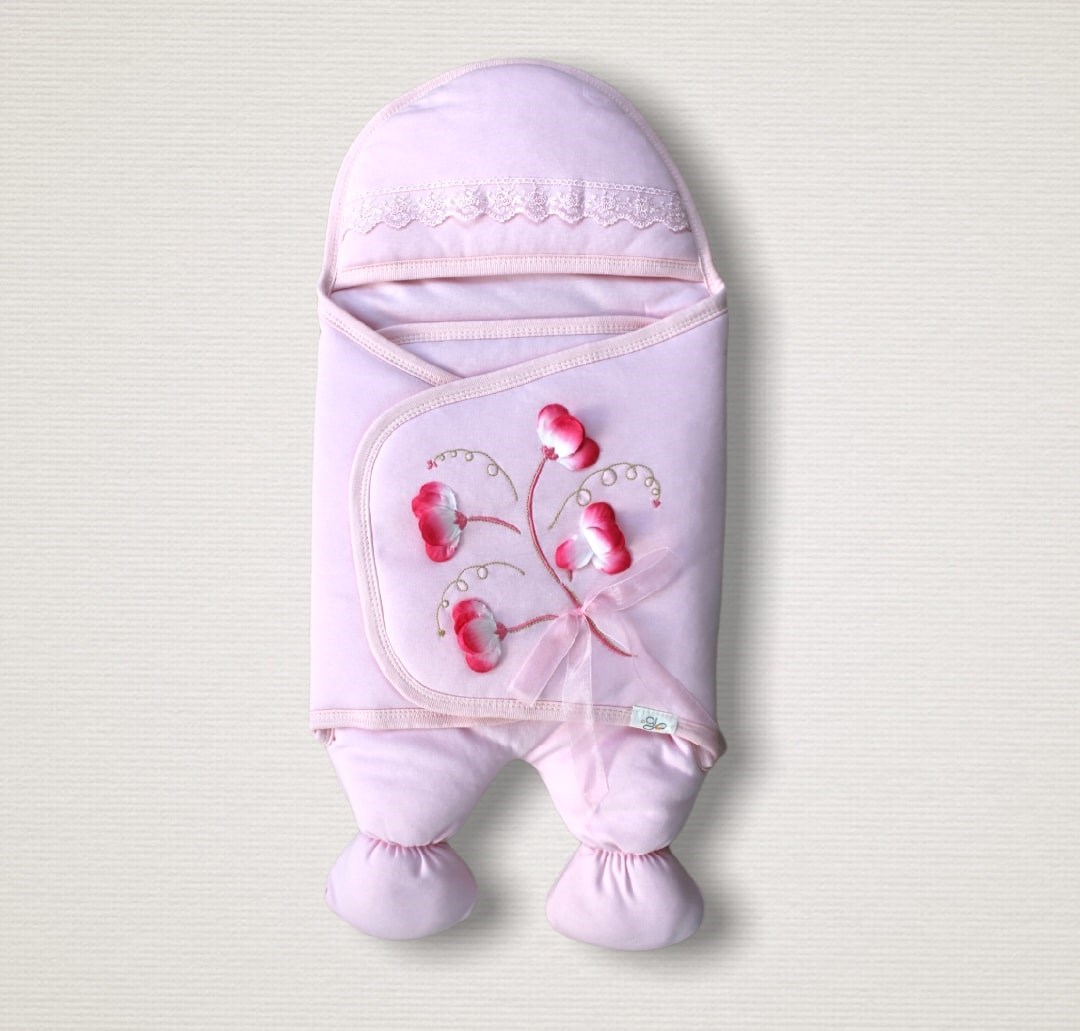 Yenidoğan Yapay Çiçek İşlemeli Şapkalı Lüks Kız Bebek Ayaklı Kundak Bebek Battaniyesi