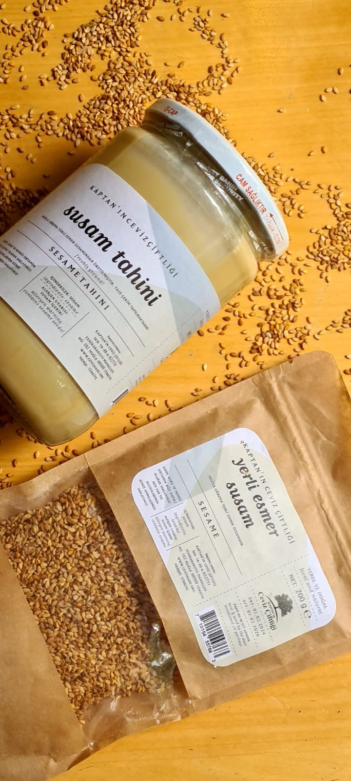 Hasat edilen coğrafi işaretli yerli Gökova esmer susamı sadece makinenin ezebileceği kadar sıcaklıkta nemi alınır ve ardından taş değirmende çekilir ve filtre edilmemesi sebebi ile kepeği ve kabuğu tahin içerisinde bulunabilir. Tahinde görülen siyah noktacıklar filtre edilmemiş yerli esmer susam kabuğu ve kepeğidir.