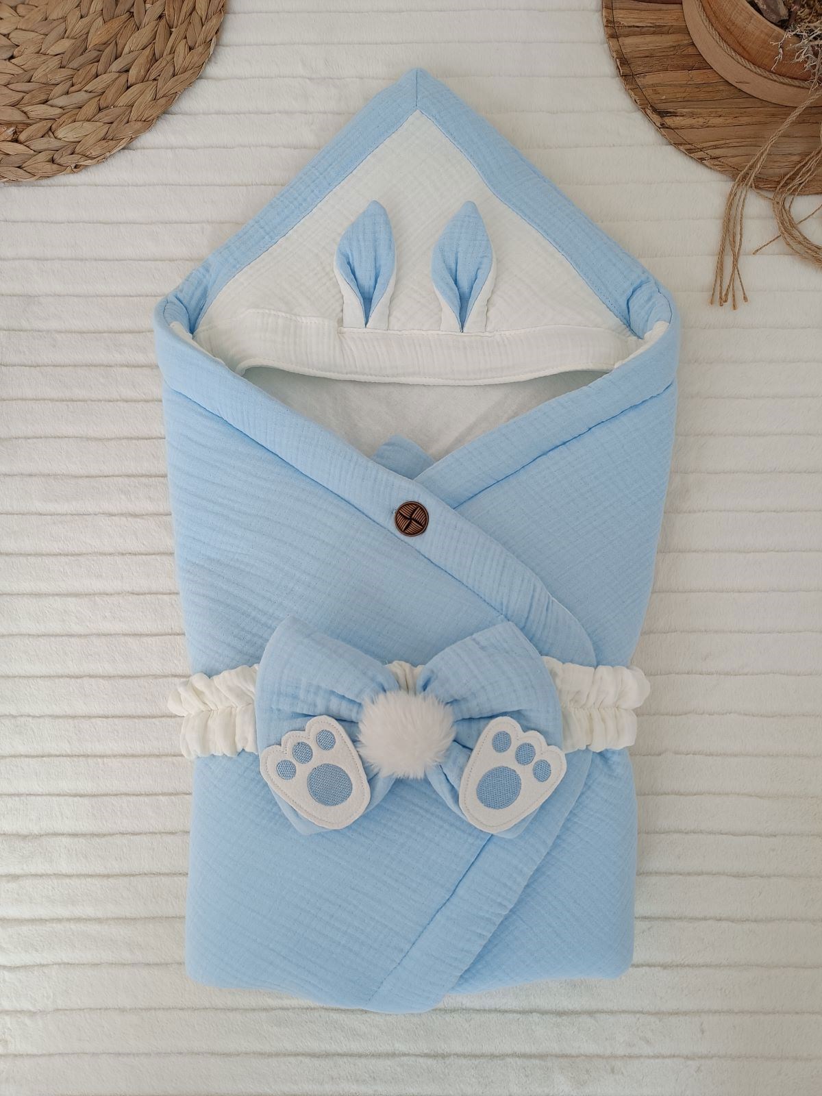 Yenidoğan 4 Kat Müslin Kumaş Kulaklı Patili Fiyonk Bebek Battaniyesi Kundak