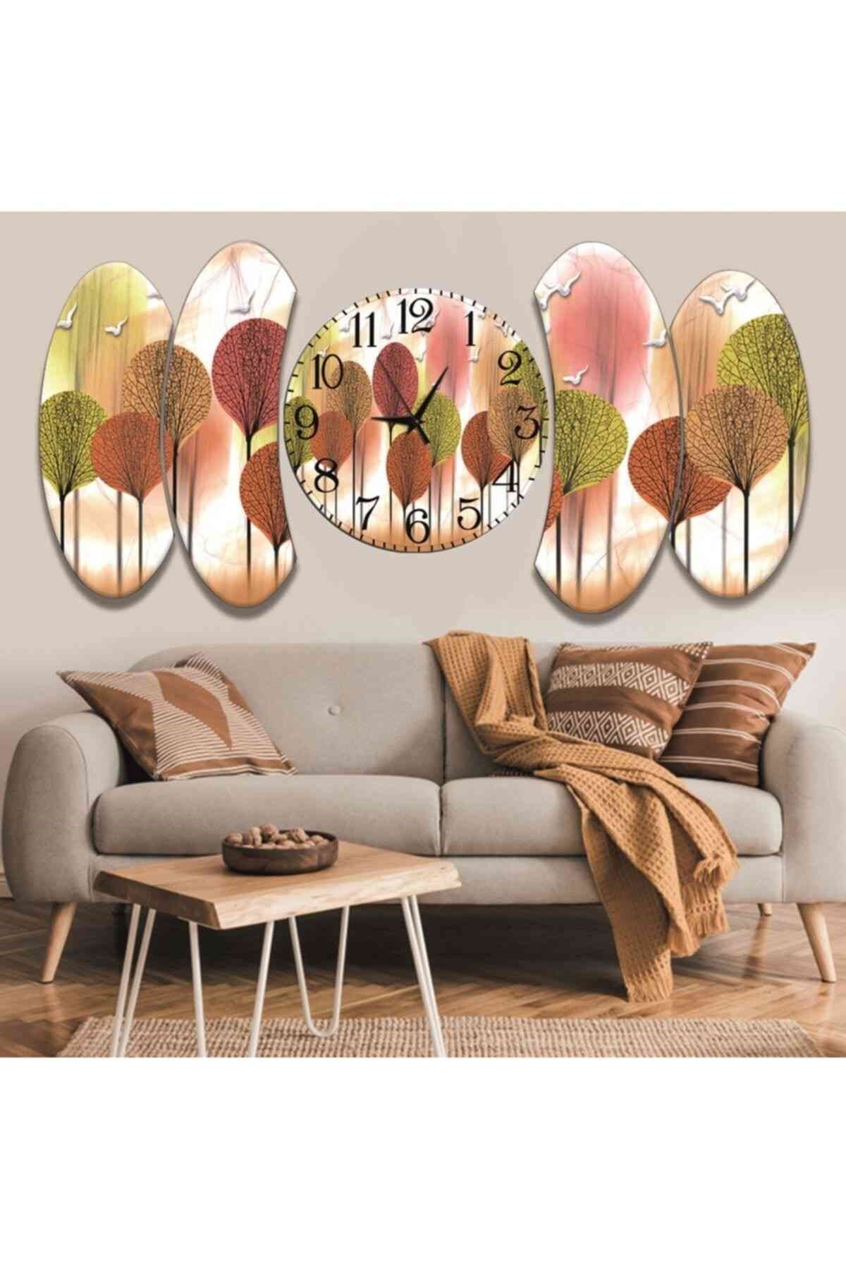 5 Parça Illüstrasyon Yaprak Tasarım Saatli Mdf Tablo