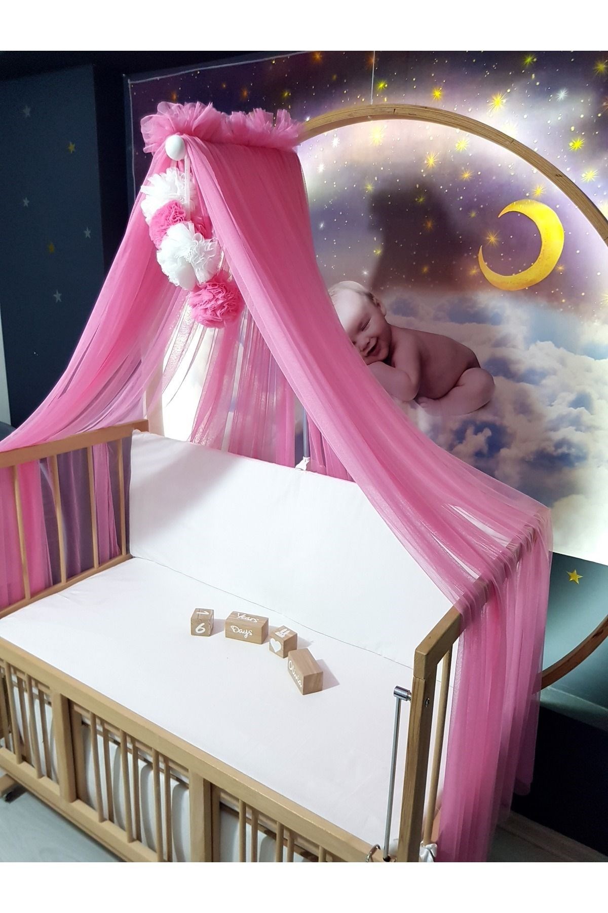 Bebek Lüks Cibinlik Takımı - Dört Ponponlu Koyu Pembe Likra Tül (Cibinlik Aparatı Dahil)