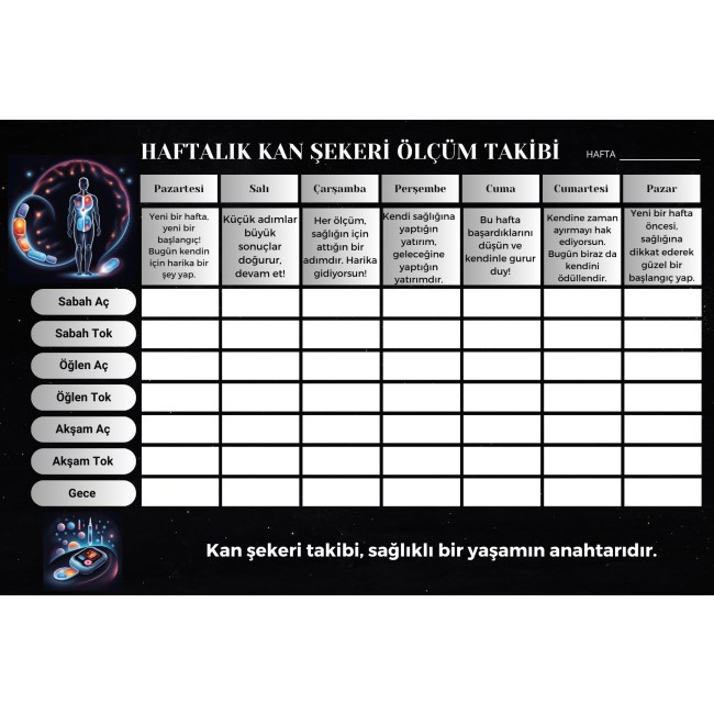 Diyabet Ölçüm Takip Çizelgesi Defteri, hem sağlık profesyonelleri hem de kişisel kullanım için ideal bir seçenektir. Diyabet yönetiminde düzen ve motivasyonu bir arada sunan bu özel tasarım defterle, hayatınıza sağlıklı bir yön verin.