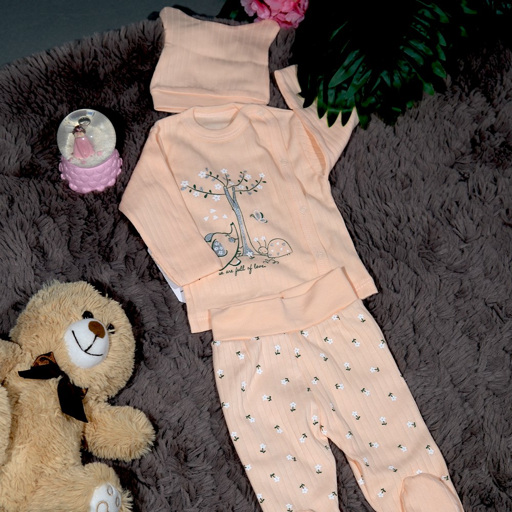 "We are full of love" yazılı doğa temalı baskısıyla dikkat çeken bu 3 parçalı yenidoğan bebek takımı; çıtçıtlı uzun kollu üst, çiçek desenli ayaklı alt ve uyumlu şapkadan oluşur. %100 pamuklu kumaşı sayesinde bebeğinizin cildini tahriş etmez, yumuşak dokusuyla rahatlık sağlar. Şeftali tonları ve zarif çiçek detaylarıyla hem estetik hem konforlu bir seçim sunar. Günlük kullanım ya da hastane çıkışı için mükemmel bir alternatif.