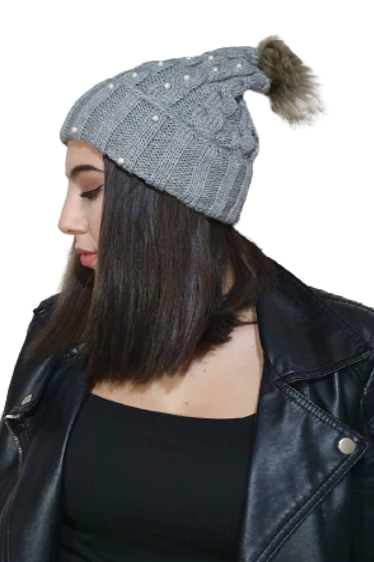 Edwol Kadın İncili Tüylü Bere Gri