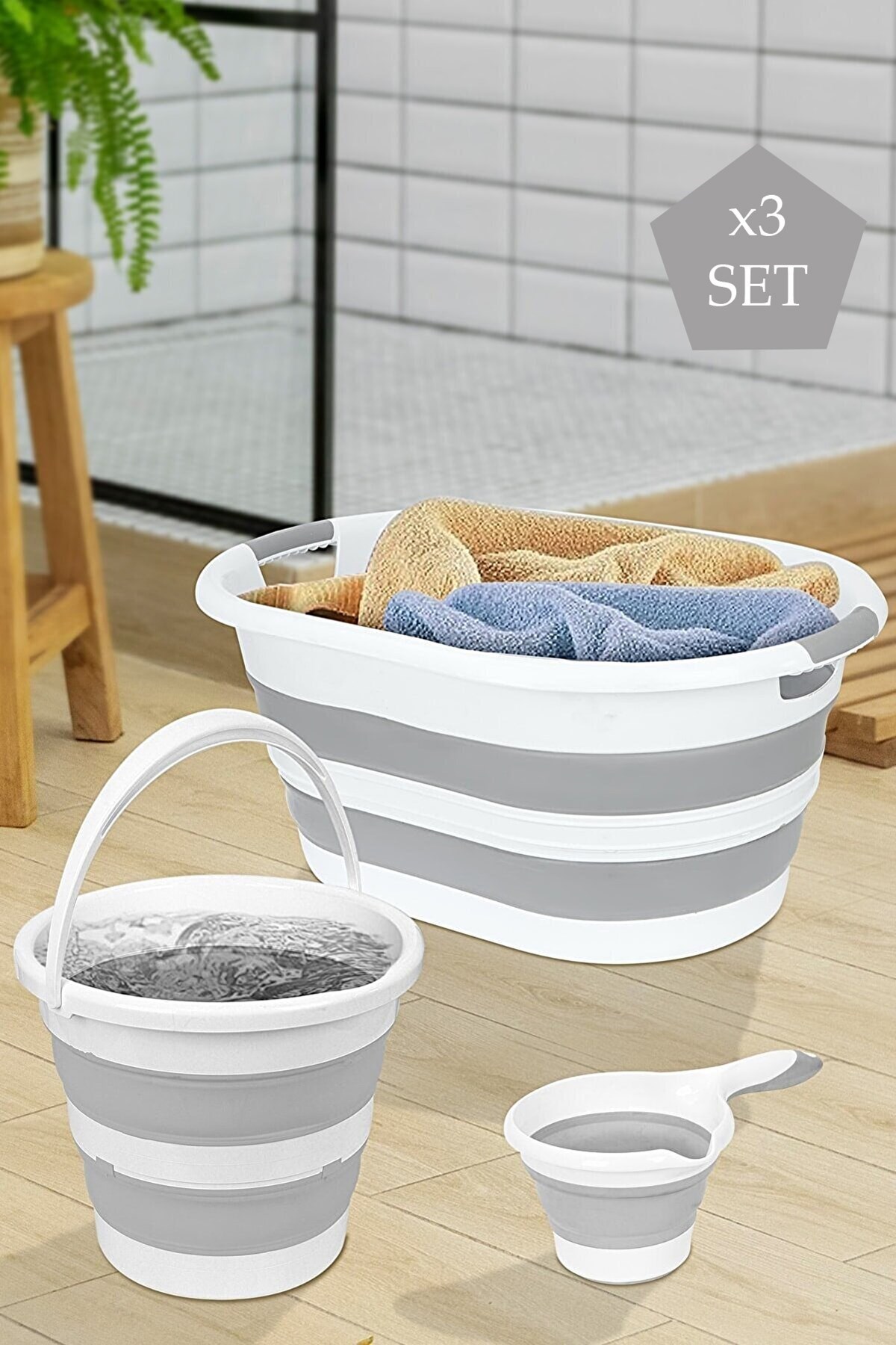 3'Lü Set Katlanır Çamaşır Sepeti 40 Lt Katlanabilir Akordiyon Su Kovası 13 Lt - Katlanır Koçero Gri