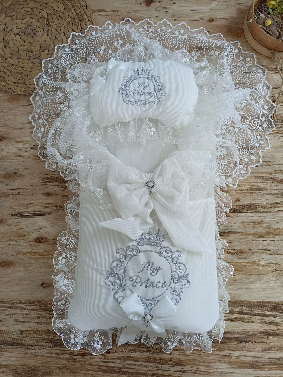 Yenidoğan Nil Taç Nakışlı Hayal Güpürlü Trilüks Kundak Bebek Battaniyesi 3lü Alt Açma Seti